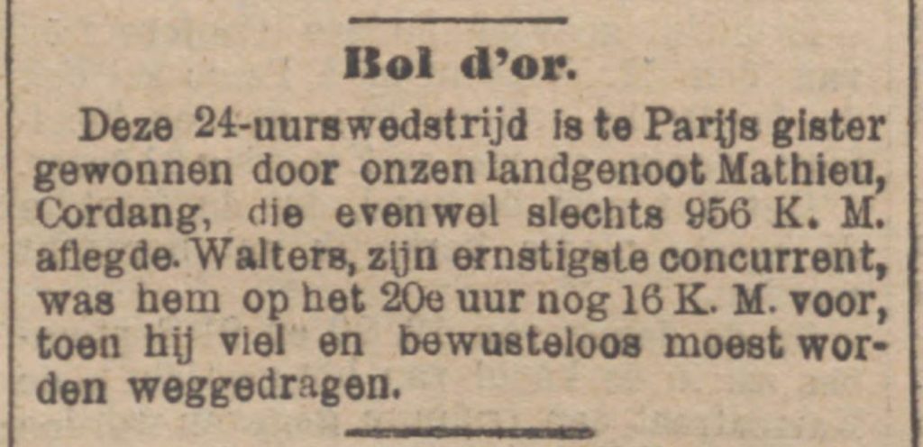 Huret was kapot en verzekerde, nooit ofte nimmer meer te zullen rijden, gaf den strijd op. De gangmakers kwamen naar mij toe, en boden nu aan om Cordang te pacen. Wat te doen in zo’n kritiek geval ? Natuurlijk “top”: de affaire was beklonken en Cordang keek als werd hij door den bliksem getroffen, toen hij den motortriplet van Huret achter zich hoorde om hem kond te doen, dat deze, plus twee prachtige tandems, ter zijner beschikking was. Dat was naar zijn zin! Het gaf hem moed om alsnu “met versnelden pas” er tussen uit te trekken. Walters liep ondertussen maar geregeld in snel tempo door en uur voor uur werd aangekondigd, dat hij steeds meer en meer op Cordang uitliep. Deze had evenwel niet de minste vrees voor Walters, wel wetende wat er na het 12e of zeker na het 18e uur gebeuren zou. Niet alleen dat Cordang weet, dat hij op het laatst verreweg in de beste conditie is, maar ook, omdat elk sportman kon zien, dat Walters aan zijne wilskracht het te wijten had, dat hij zich op ’t laatst geheel uitgeput zou gevoelen. Cordang krijgt dus gangmakende tandems van Huret ter beschikking en zet nu voor het eerst door. Kolossaal loopt hij in, telkens als hij Walter inhaalt en voorbij trapt dondert ’t van het gejuich.