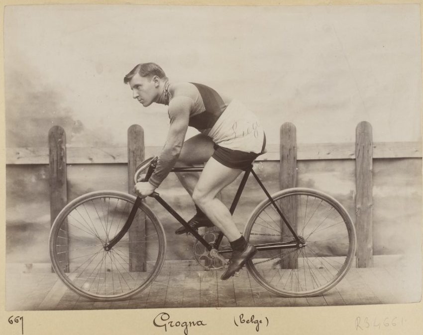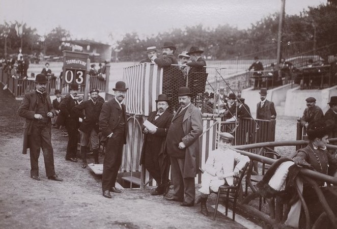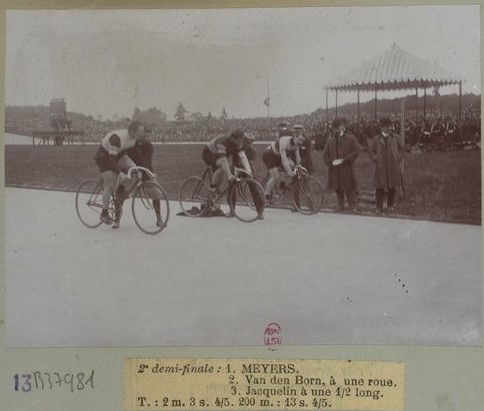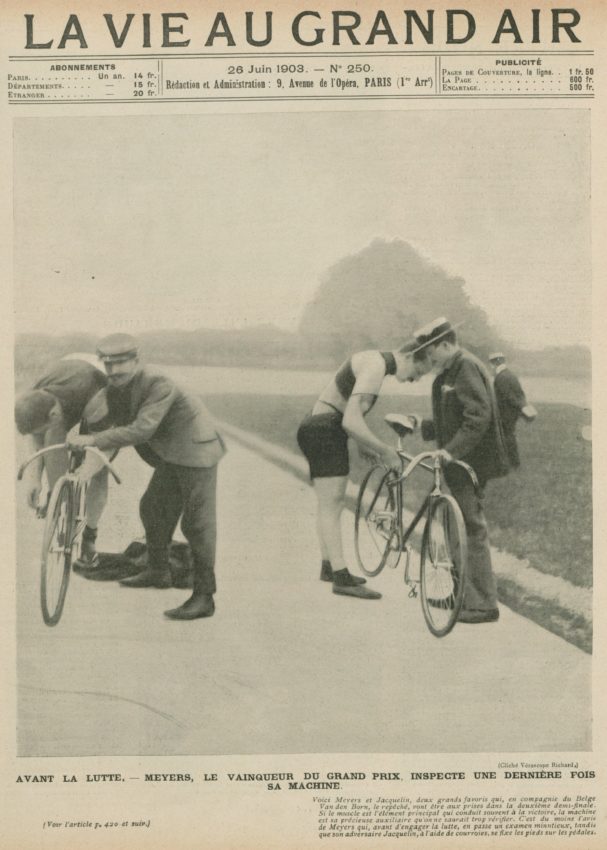 Hier zijn Harie Meyers en Edmond Jacquelin, de twee grote favorieten die, samen met de Belg Van den Born gaan strijden in de tweede halve finale. Als de spieren het belangrijkste element is dat vaak naar de overwinning leidt, is de machine het kostbare hulpmiddel dat niet genoeg kan worden gecheckt voor de wedstrijd. Dat is tenminste de mening. Meyers, voordat hij het gevecht aangaat, slaagt voor een nauwgezet onderzoek, terwijl zijn tegenstander Jacquelin, met behulp van riemen, zijn voeten op de pedalen fixeert. Beeld: LA VIE AU GRAND AIR N° 250, 26 Juin 1903Meyers, Van den Born en Jacquelin aan de start van de 2e demi-finale