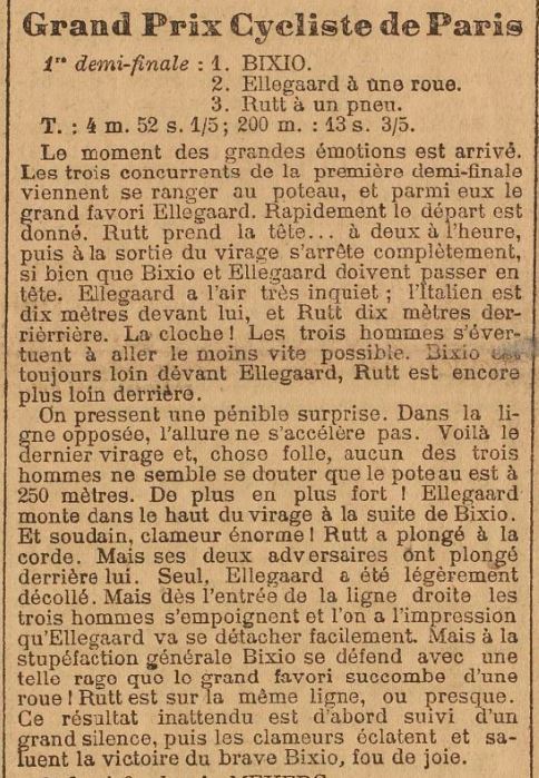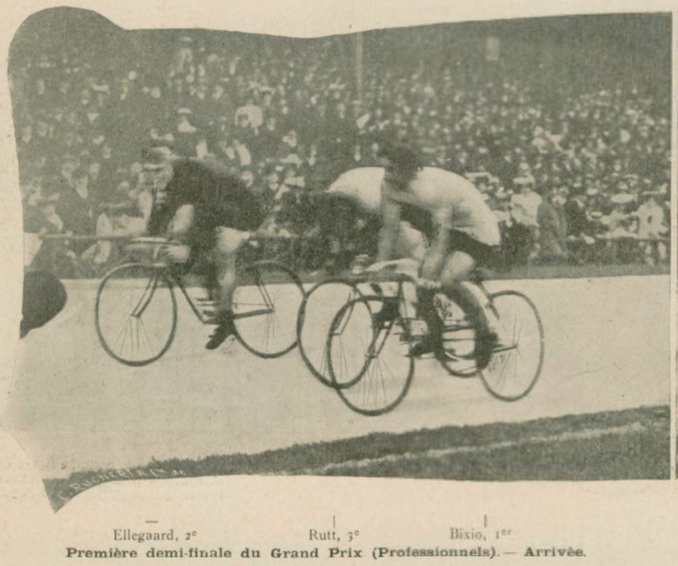 Thorvald Ellegaard reed in de eerste demifinale met de Italiaan Pietro Bixio en de Duitser Walter Rutt. Bij het startschot neemt Rutt de leiding, doch gaat zo langzaam dat Ellegaard en Bixio naar voren komen. Deze laatste leidt dan met 10 mater voor Ellegaard, die op zijn beurt 10 meter voor Rutt is. De pace is verschrikkelijk langzaam en zelfs de aankondiging van de laatste ronde (de Vincennes baan meet 500 meter), doet de concurrenten niet versnellen. Alle drie rijden boven in de bocht, als plotseling op 250 meter van de finish Rutt naar beneden vliegt en met een razende spurt de leiding neemt; doch Ellegaard en Bixio zijn op hun hoede geweest en zijn terzelfder tijd gevolgd. Op het laatste rechte eind zijn alle drie de renners gelijk, en heeft men daar het idee, dat Ellegaard zijn concurrenten gaat domineren. Doch tot algemene verwondering van alle toeschouwers verdedigt Bixio zich met zulk een kracht, dat hij vóór de grote favoriet met een wiellengte de eindstreep passeert, terwijl Rutt een banddikte met Ellegaard verschilt. Dit onverwachte resultaat wordt gevolgd door een grote stilte van de zijde van het publiek, nog verwonderd. Dan buldert het los en wordt Pietro Bixio een ovatie gebracht voor zijn terecht verdiende overwinning. De Italiaan zelf was gek van vreugde.