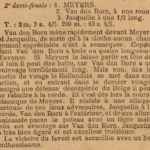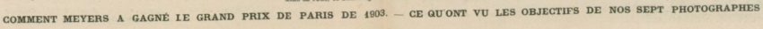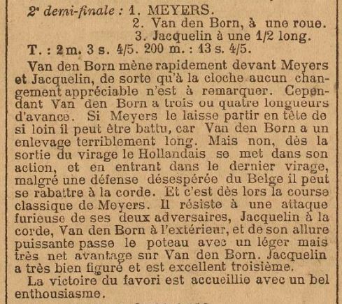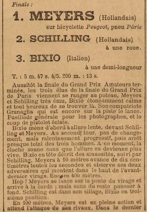 „Voor de wedstrijd, die zal decideren wie de man van de dag in Tout-Paris is, ga ik Meyers in zijn kleedkamer opzoeken. Ik vond hem op de buik gelegen, op de massage-bank, terwijl zijn masseur hem hielp. Meyers heeft zijn hoofd in de handen en zegt mij : “Ik ben zenuwachtig en voel mij ziek. Het lijkt mij of ik binnen 5 minuten zal gaan sterven”. Vijf minuten, later verschijnt Meyers op de baan, heeft zich zelf tot kalmte gedwongen en is koelbloedig. Dat brengt hem zijn overwinning! Toch is er hard gestreden moeten worden, want Schilling en Bixio, overzenuwd, hebben nog meer dan anders er alles op gezet om te overwinnen, en voet voor voet heeft Harie Meyers, met een bewonderenswaardige kracht de overwinning behaald. Het verloop van de strijd was zeer eenvoudig. Op 400 meter van de eindstreep zijn alle drie de renners in de hoogste bocht. Meyers veinst weg te spurten, door naar beneden te gaan. Zijn twee tegenstanders volgen hem onmiddellijk en Meyers wacht de eersten aanval af. In de laatste bocht zet Schilling aan, die een ogenblik Meyers passeert, terwijl Bixio hem aan de anderen kant op zijde komt. Dan, recht voor zich uit, gelijk ’n geweerkogel vliegt Meyers op Schilling aan, passeert deze en wint met een wiellengte zijn tweede Grand Prix de Paris. Schilling was een half wiellengte voor op Bixio. Voor de vierde maal reed Meyers in de finale, voor de tweede maal overwon hij. Onbeschrijfelijk is het tumult dat daarop volgt. het volk juicht de zo sympathieke Hollander luidde toe.