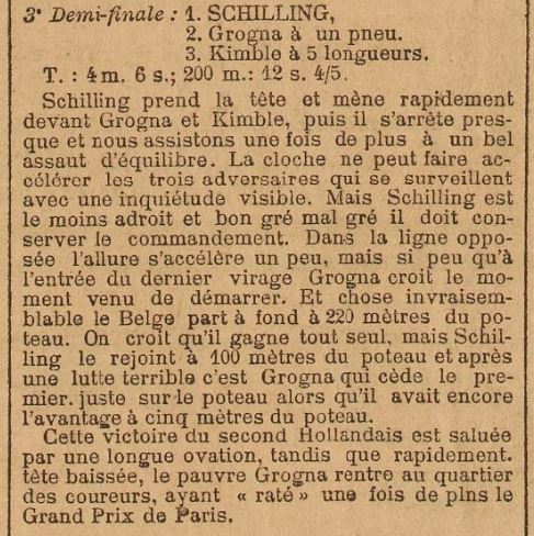 In de derde demi-finale tussen de Nederlander Guus Schilling, de Belg Louis Grogna en de Amerikaan Owen Kimble, leidde eerst Schilling, toen kwam er een evenwichtsmoment, daar geen van drieën wilde leiden. Grogna spurt het eerst, men gelooft, dat hij zeer gemakkelijk gaat winnen, als 100 meter voor de finish Schilling hem ter zijde komt. Dan volgt er een nek aan nek race. 5 meter voor de finish heeft Grogna nog enig voordeel, op de rode lijn passeert Schilling met een band dikte voor de Belg terwijl Kimble, geheel vergeten, 5 lengten achter is.