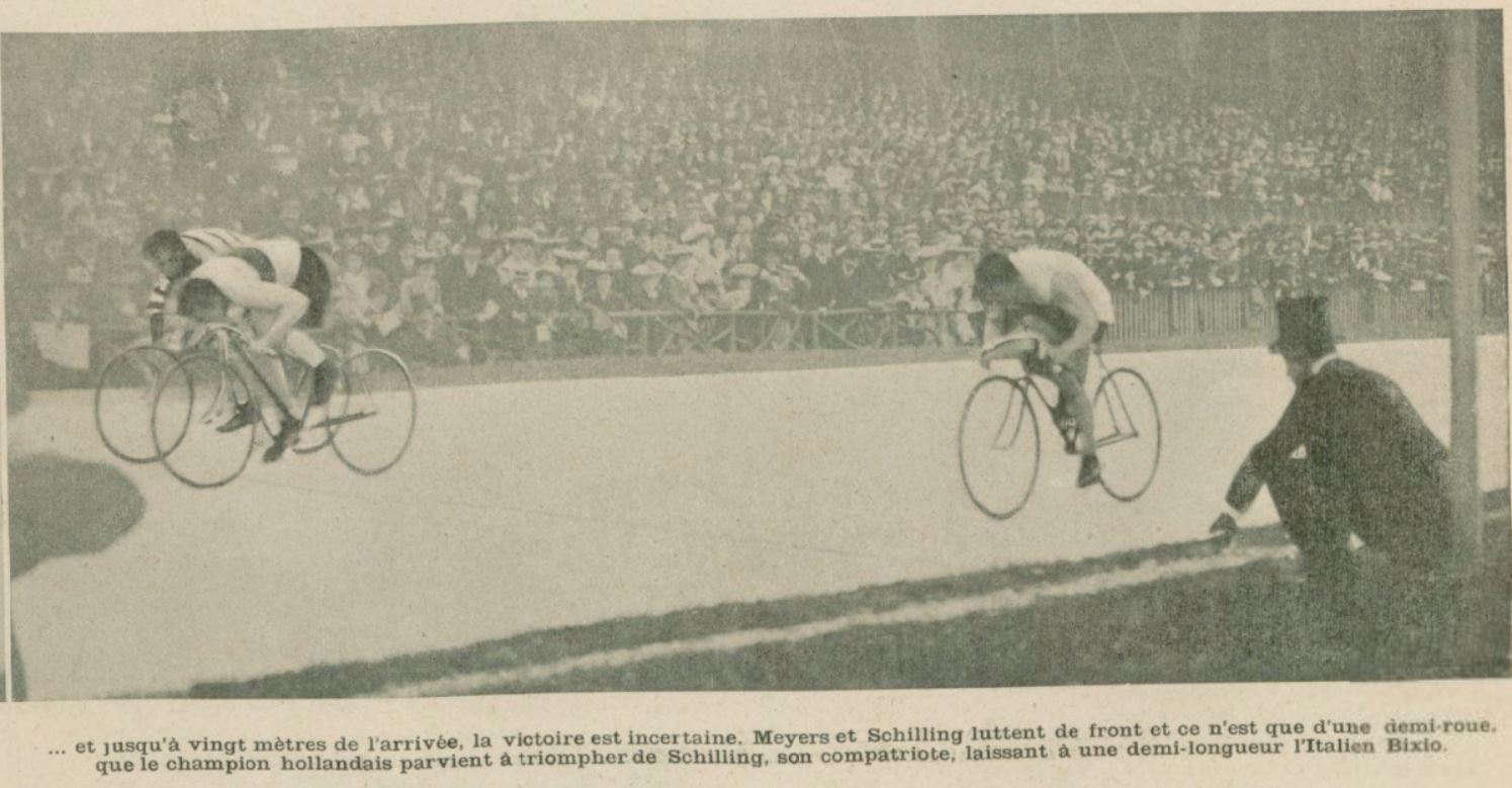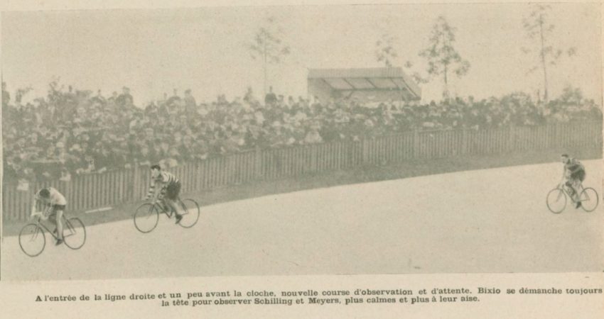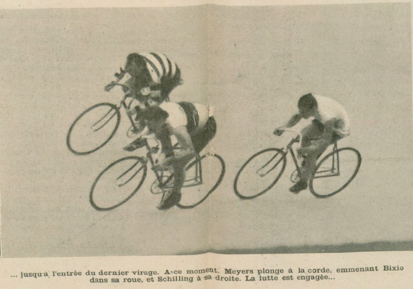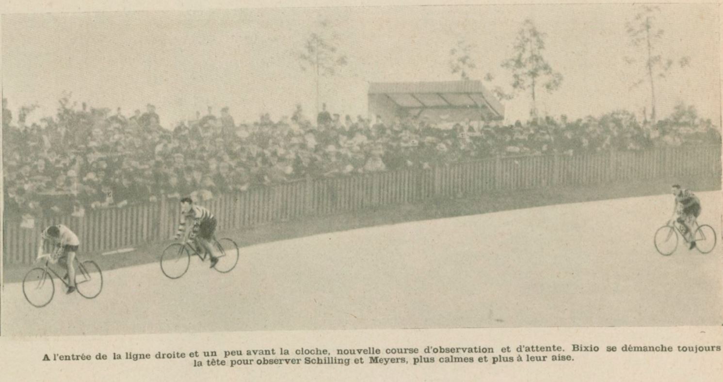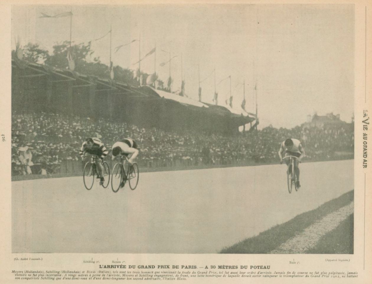 Hoe Meyers de Grand Prix de Paris won, wat hebben de 7 fotografen gezien vanaf hun plaats aan de pisteDe drie gekwalificeerd voor de finale van de Grand Prix de Paris komen onder het bevel van de starter in de rij. Beeld: LA VIE AU GRAND AIR N° 250, 26 Juin 1903Vanaf het begin begint een trage race. Het is wie niet de leiding zal nemen. Bij de ingang van de eerste bocht moet Bixio echter op kop rijden, gevolgd door Schilling en Meyers. Beeld: LA VIE AU GRAND AIR N° 250, 26 Juin 1903Een wachtende race gedurende de eerste ronde. Bixio, nog steeds aan de leiding, hield Schilling in de gaten die, door ingenieuze surplaces, ernaar streefde de tweede positie te behouden. Beeld: LA VIE AU GRAND AIR N° 250, 26 Juin 1903In de tweede ronde en in de eerste bocht veranderde de fysionomie van de race niet… Beeld: LA VIE AU GRAND AIR N° 250, 26 Juin 1903maar bij het binnenkomen van de tegenoverliggende lijn, en bij het verlaten van de bocht, rijden ze al iets sneller… De concurrenten vallen bijna helemaal stil als ze de volgende bocht naderden… tot grote wanhoop van het publiek dat luid protesteert. Beeld: LA VIE AU GRAND AIR N° 250, 26 Juin 1903Bij het ingaan van de rechte lijn en iets voor de bel, een nieuwe observatie- en afwachtingsrace. Bixio tilt nog steeds zijn hoofd op om Schilling en Meyers te observeren, deze zijn rustiger en meer op hun gemak. Beeld: LA VIE AU GRAND AIR N° 250, 26 Juin 1903Na de bel voor de laatste ronde, bovenaan de eerste bocht volgen de deelnemers elkaar dichter, houden elkaar in het oog. Beeld: LA VIE AU GRAND AIR N° 250, 26 Juin 1903…totdat je de laatste bocht ingaat. Op dit moment duikt Meyers naar beneden, Bixio in zijn wiel en Schilling naar rechts. Het gevecht is begonnen… Beeld: LA VIE AU GRAND AIR N° 250, 26 Juin 1903…en tot twintig meter van de finish is de overwinning onzeker. Meyers en Schilling vechten met een half wiel om de zege, voor de Italiaan Bixio. De Nederlandse kampioen weet nipt te zegevieren over zijn landgenoot Schilling, laat de Italiaan Bixio op halve lengte achter zich. Beeld: LA VIE AU GRAND AIR N° 250, 26 Juin 1903
