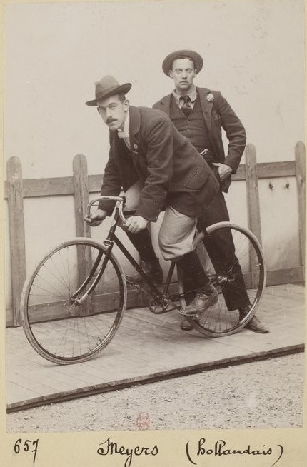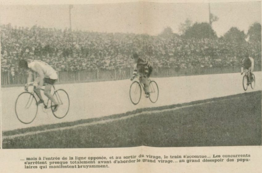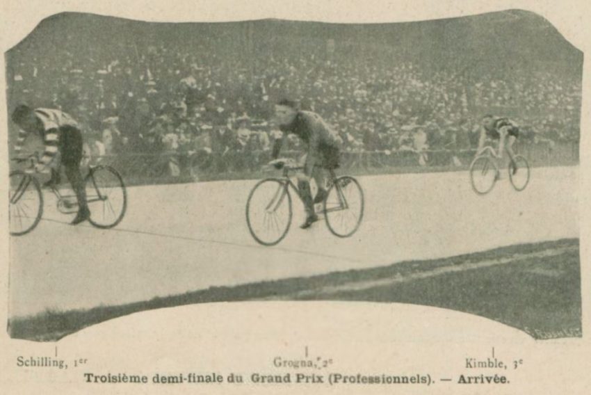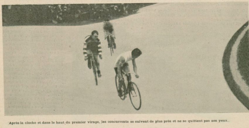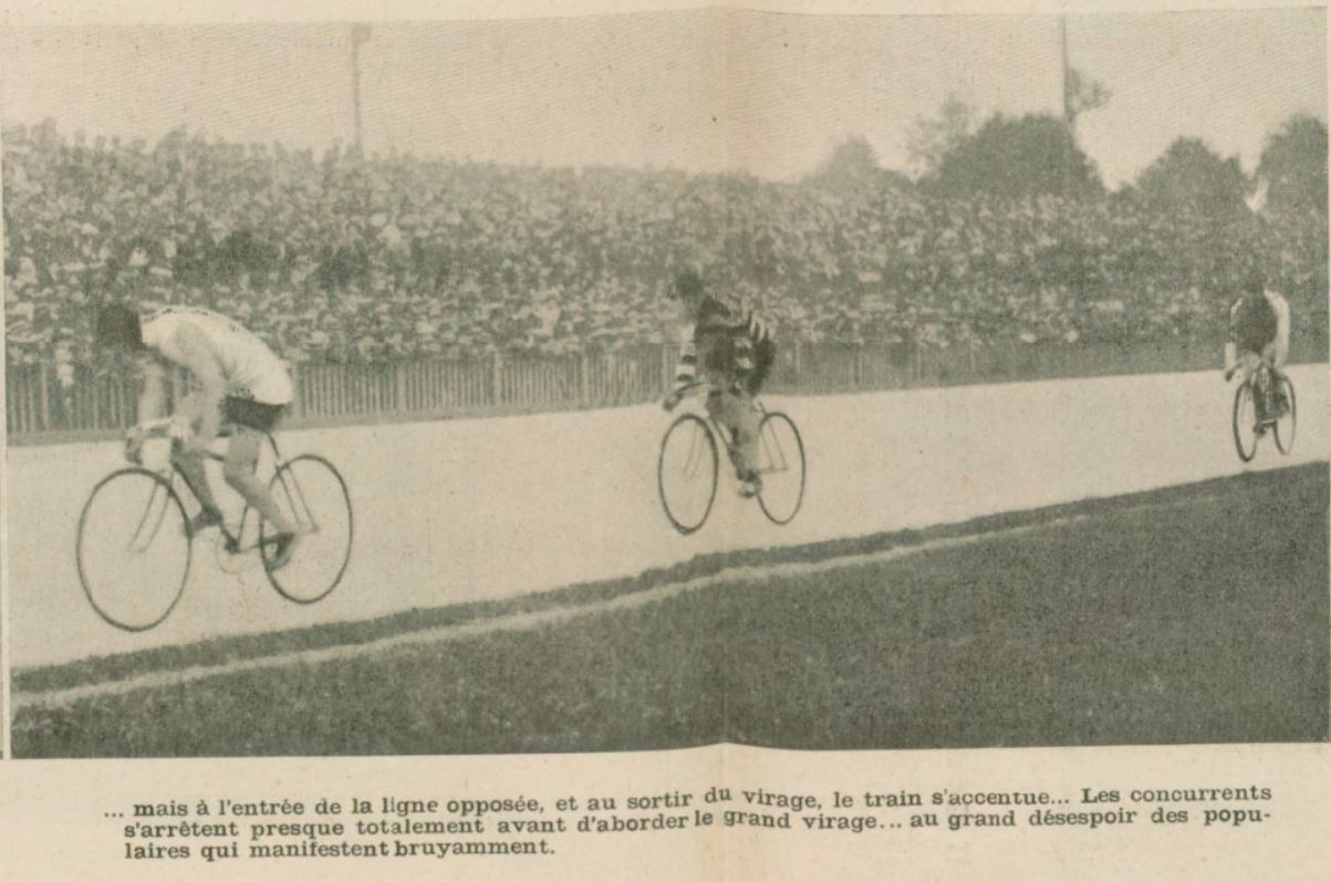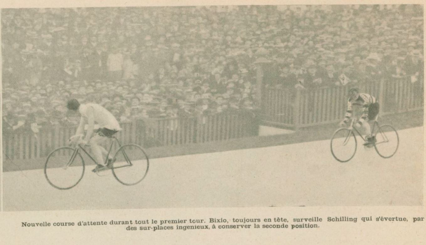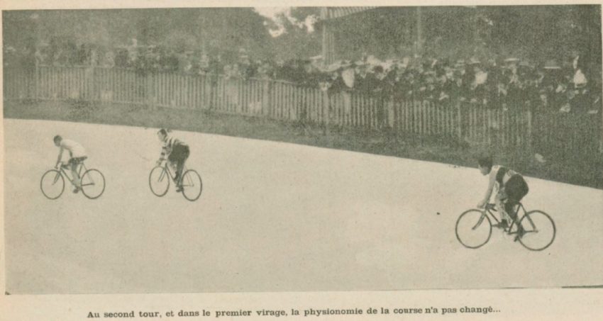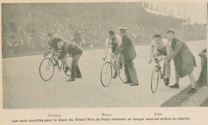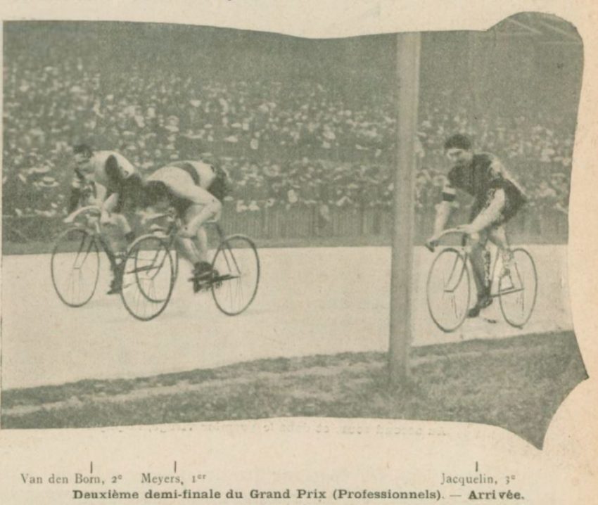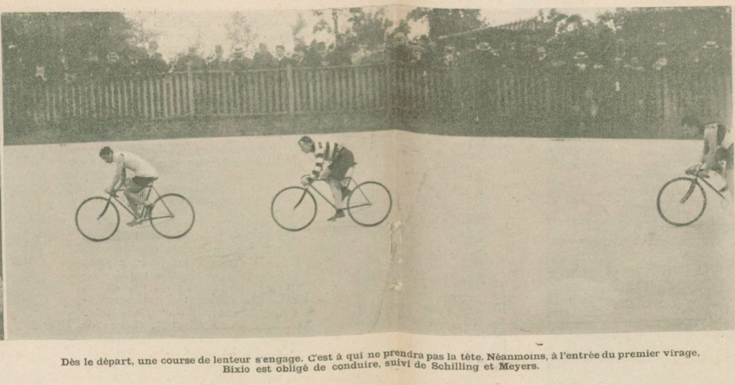 Hoe Meyers de Grand Prix de Paris won, wat hebben de 7 fotografen gezien vanaf hun plaats aan de pisteDe drie gekwalificeerd voor de finale van de Grand Prix de Paris komen onder het bevel van de starter in de rij. Beeld: LA VIE AU GRAND AIR N° 250, 26 Juin 1903Vanaf het begin begint een trage race. Het is wie niet de leiding zal nemen. Bij de ingang van de eerste bocht moet Bixio echter op kop rijden, gevolgd door Schilling en Meyers. Beeld: LA VIE AU GRAND AIR N° 250, 26 Juin 1903Een wachtende race gedurende de eerste ronde. Bixio, nog steeds aan de leiding, hield Schilling in de gaten die, door ingenieuze surplaces, ernaar streefde de tweede positie te behouden. Beeld: LA VIE AU GRAND AIR N° 250, 26 Juin 1903In de tweede ronde en in de eerste bocht veranderde de fysionomie van de race niet… Beeld: LA VIE AU GRAND AIR N° 250, 26 Juin 1903maar bij het binnenkomen van de tegenoverliggende lijn, en bij het verlaten van de bocht, rijden ze al iets sneller… De concurrenten vallen bijna helemaal stil als ze de volgende bocht naderden… tot grote wanhoop van het publiek dat luid protesteert. Beeld: LA VIE AU GRAND AIR N° 250, 26 Juin 1903Bij het ingaan van de rechte lijn en iets voor de bel, een nieuwe observatie- en afwachtingsrace. Bixio tilt nog steeds zijn hoofd op om Schilling en Meyers te observeren, deze zijn rustiger en meer op hun gemak. Beeld: LA VIE AU GRAND AIR N° 250, 26 Juin 1903Na de bel voor de laatste ronde, bovenaan de eerste bocht volgen de deelnemers elkaar dichter, houden elkaar in het oog. Beeld: LA VIE AU GRAND AIR N° 250, 26 Juin 1903…totdat je de laatste bocht ingaat. Op dit moment duikt Meyers naar beneden, Bixio in zijn wiel en Schilling naar rechts. Het gevecht is begonnen… Beeld: LA VIE AU GRAND AIR N° 250, 26 Juin 1903…en tot twintig meter van de finish is de overwinning onzeker. Meyers en Schilling vechten met een half wiel om de zege, voor de Italiaan Bixio. De Nederlandse kampioen weet nipt te zegevieren over zijn landgenoot Schilling, laat de Italiaan Bixio op halve lengte achter zich. Beeld: LA VIE AU GRAND AIR N° 250, 26 Juin 1903