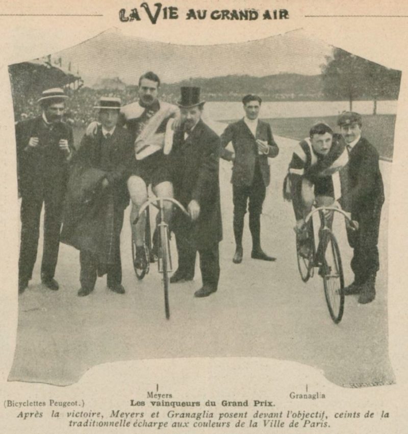 Na de overwinning poseren Meyers (beroepsrenners) en Granaglia (amateurs) voor de camera, met de traditionele sjaal in de kleuren van de stad Parijs. Beeld: LA VIE AU GRAND AIR N° 250, 26 Juin 1903
