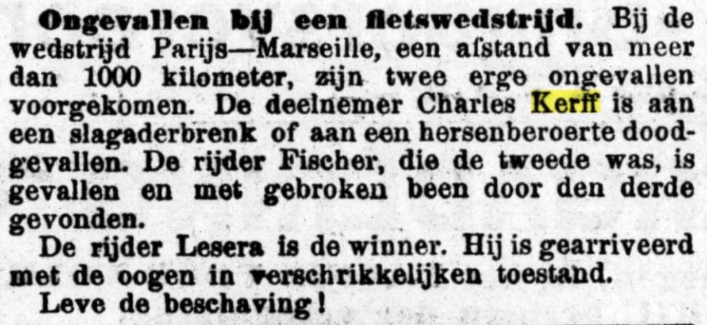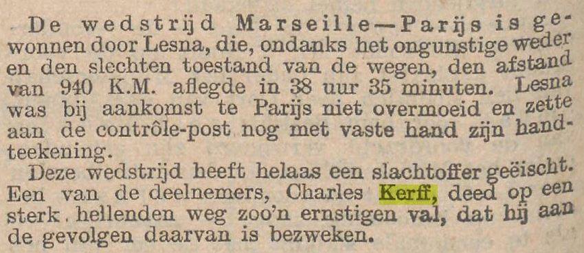 Volgens de overlevering had de dood van Charel Kerff een andere oorzaak. Brouwers: „Charel zou, op het moment dat hij koploper Lucien Lesna dreigde in te halen, door chauvinistische Franse supporters van de fiets zijn getrokken en dood geslagen. Dergelijke aanslagen waren in de oertijd van de wielersport geen zeldzaamheid. Het is dus niet onmogelijk, dat Charel Kerff zo aan zijn einde is gekomen. Overigens beweerden boze tongen ook. dat hij als gevolg van dopinggebruik dood van zijn fiets was gevallen. Nu nog weet niemand de juiste oorzaak.”
