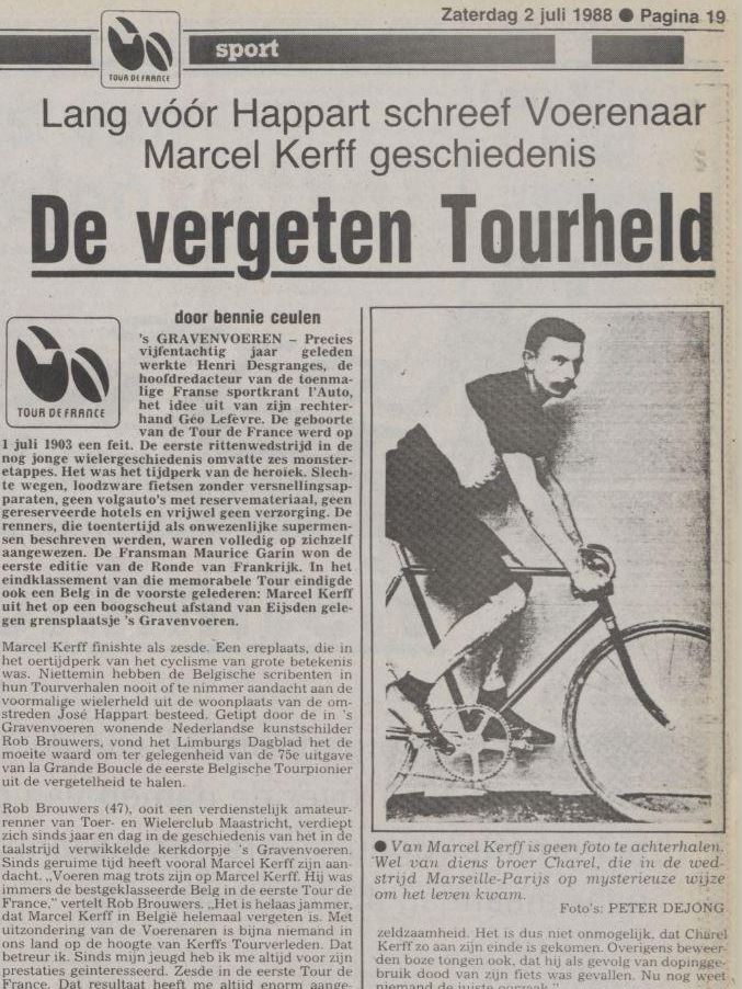 Marcel Kerff finishte als zesde. Een ereplaats, die in het oertijdperk van het cyclisme van grote betekenis was. Niettemin hebben de Belgische scribenten in hun Tourverhalen nooit of te nimmer aandacht aan de voormalige wielerheld uit de woonplaats van de omstreden José Happart besteed. Getipt door de in ’s Gravenvoeren wonende Nederlandse kunstschilder Rob Brouwers, vond het Limburgs Dagblad het de moeite waard om ter gelegenheid van de 75e uitgave van la Grande Boucle de eerste Belgische Tourpionier uit de vergetelheid te halen.