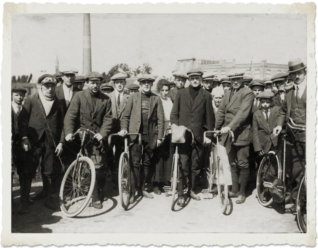 Te 10 minuten over half zeven had aan het Roomhuis te ’s-Gravenhage het vertrek plaats. De verslaggever, die het genoegen had de rit in een gloednieuwe Winton-Six van de Haagsche Autom. Mij. mee te maken, vertrok een minuut of tien later dan de renners. Ofschoon wij een fatsoenlijk vaartje reden hadden we het hoofdpeloton toch eerst een heel eind voorbij Leiden ingehaald. Dit bestond toen nog uiteen kleine 40 rijders, waaronder ook de veteranen P. Adrian, G. van Eembergen en Cees van der Wiel.