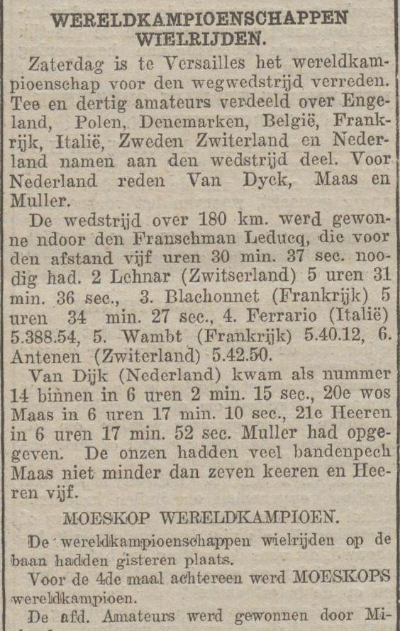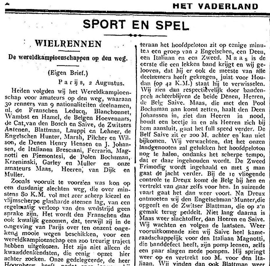 Heden volgden wij het Wereldkampioenschap voor amateurs op den weg, waaraan 30 renners van 9 nationaliteiten deelnamen, nl. de Franschen Leducq, Blanchonnet, Wambst en Hamel, de Belgen Hoevenaars, de Cat, van den Bosch en Saive, de Zwitsers Antenen, Blattman, Lauppi en Lehner, de Engelsen Hunter, Marsh, Pilcher en Wilson, de Denen Henry Hensen en J. Johansen, de Italianen Bresciani, Ferrario, Magnotti en Piemontesi, de Polen Bochsman, Krzeninski, Garley en Muller en onze Nederlandse amateurs Jan Maas, Cees Heeren, Daan van Dijk en Nol Muller.