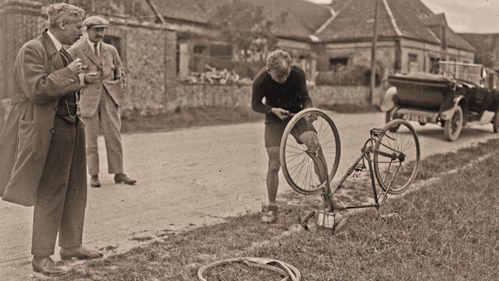 Onze gedelegeerde, de heer Hoornberg, heeft, nadat onze jongens bij een proefrit 14 lekke banden kregen, tevergeefs getracht het parcours gewijzigd te Krijgen. Ditmaal heeft Jan Maas alleen 7, Heeren 5, van Dijk 4 en Muller eveneens 4 banden stuk gereden. Aan de nodige zorgen voor banden materiaal heelt het niet ontbroken; verschillende fabrikaten, als Pouchois, Wolber, Hutchison, Tabucchi, zelfs Vredestein’s Browns zijn beproefd en al deze soorten zijn in den wedstrijd dooreen gereden. Niets bleek tegen de scherpe stenen bestand.