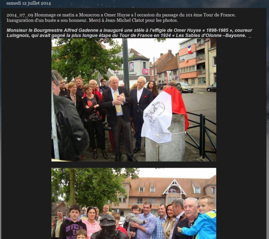 Omer Huyse, geboren Kortrijkzaan in 1898 zit rustig als een maraboe wanneer hij verteld over zijn rennersloopbaan.. Hij ziet er echt nog vivant uit. Een potje bier smaakt hem best en zet hem aan nog smaakvoller verhalen op te dissen. Ook was hij een trouwe ploegmaat van Lucien Buysse in 1926. Voordien had hij al aan de Tour deelgenomen in 1924 en 1925. Hij won in 1924 bij de categorie der “onverzorgden”, de “isolé’s”. In de ronde bereikte hij een absolute plek door de langste rit uit de ganse geschiedenis te winnen, met name etappe van Sables d’Ollonne naar Bayonne, 485 km lang.