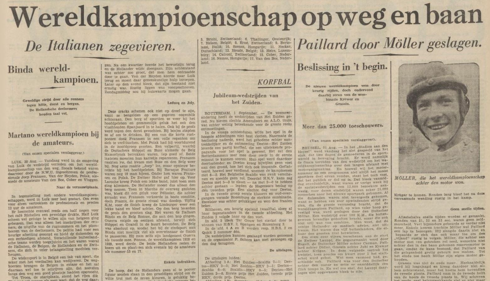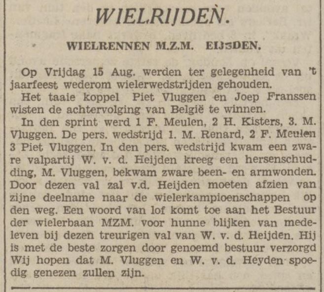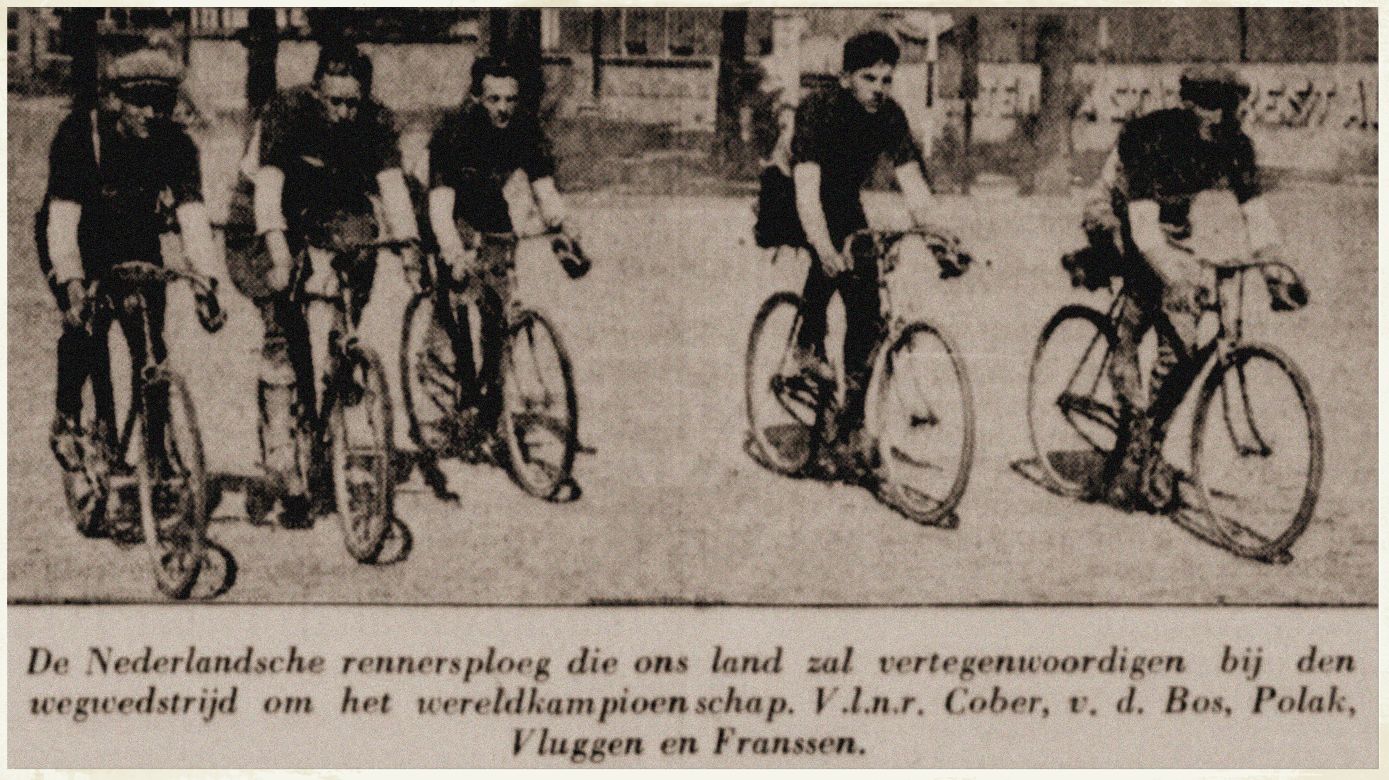 De wereldkampioenschappen op de weg zullen 30 augustus (1930) a.s. zal plaats vinden met vertrek en aankomst te Luik alwaar de Nederlandse kleuren zullen worden verdedigd door Joep Franssen, Jan v. d. Heijden Amsterdam, en Bram Polak Steenbergen, terwijl als amateurs zijn aangewezen Willy Cober Hoensbroek, Piet Vluggen Ulestraten en W. v.d. Heijden Limmel Maastricht. Daar laatstgenoemde Zondag voor 8 dagen te Eijsden een flinke val deed, waarbij hij een lichte hersenschudding kreeg zal hij vervangen worden door de amateur C. v.d. Bos uit Enschede, die een paar weken geleden amateurkampioen van Nederland 1930 is geworden.