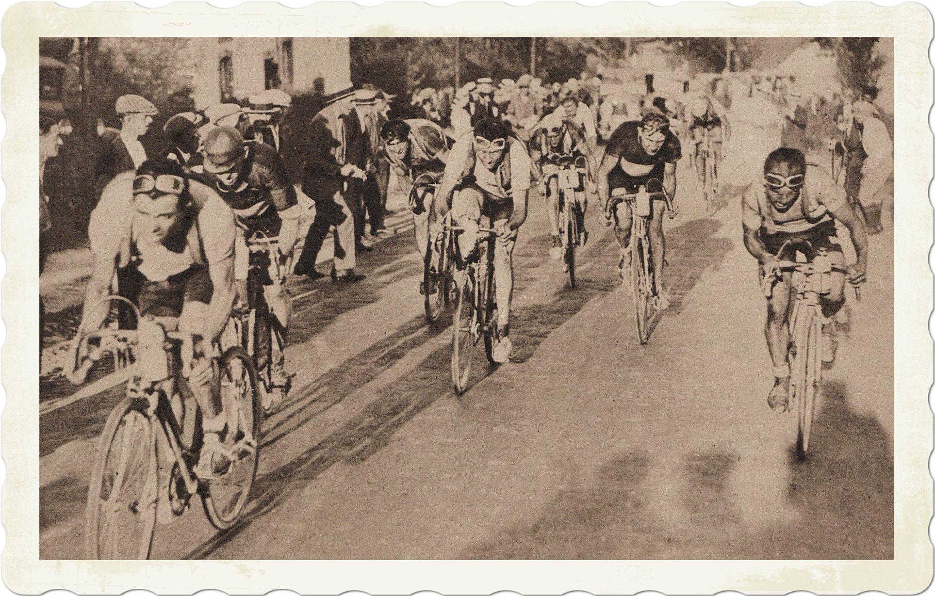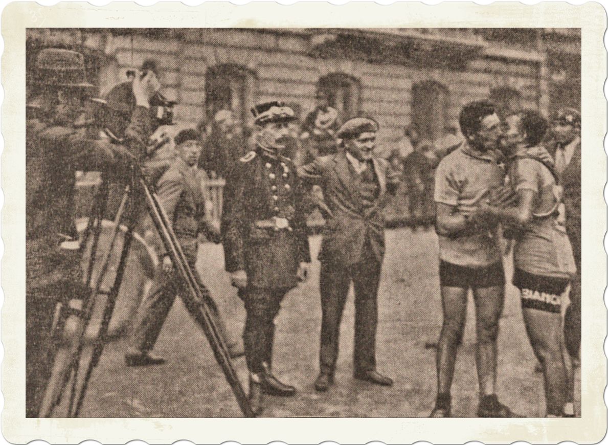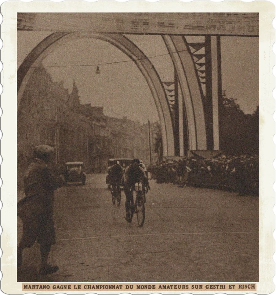 Attention ! attention ! kondigde de luidspreker aan: Alfredo Binda, Learco Guerra, met de Belg Georges Ronsse (wereldkampioen van 1929) hadden zich 10 km voor Luik van de anderen los weten te werken. De strijd zal gaan om de ereplaats tussen deze drie grote routiers, twee Italianen en één Belg. De luidspreker kondigde aan, dat de drie genoemde renners Luik hebben bereikt. Een geweldig lawaai stijgt op. Daar komen ze! Op de prachtige brede Asfaltstraat met het publiek achter houten hekken wordt de eindstrijd uitgevochten. De renners komen in zicht. Binda, de grote Italiaan voorop. Guerra naast hem en de Belg Ronsse er direct achter. Onder oorverdovend hoera zetten de die op 500 meter de eindspurt in: ze staan in de pedalen! Het gaat ongelooflijk hard. Binda gaat het eerste over de streep. Guerra aan zijn wiel en Ronsse op éen lengte.
