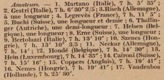 Wij kunnen ruim tevreden zijn met de prestaties van onze jongens. Zij hebben allen (op v. d. Heyden na) de wedstrijd uitgereden en zeer eervolle plaatsen bezet. Bij de profs reden Franssen en Polak een goede wedstrijd, ze waren steeds bij de hoofdgroep, uitgezonderd toen Polak een lekke band kreeg. Franssen kwam 13 minuten na Binda binnen en Polak na 20 minuten. En wat de winnaars betreft, geruime tijd heeft België zowel wat kwantiteit als kwaliteit betreft, overheerst. Dat kan nu thans niet meer gezegd worden. Frankrijk kan momenteel bogen op minstens evenveel en even goede routiers. Maar Italië spant thans wel de kroon. Heeft dit land met zijn Binda, Girardengo, Grandi, Piemontesi, Guerra e.a. niet de grootste wegrenners? Kort geleden, 10 Augustus, had in Italië een voorbereidingsrit plaats over 130 km. Deze won Guerra met een uurgemiddelde van 39 km! En dat op de weg!