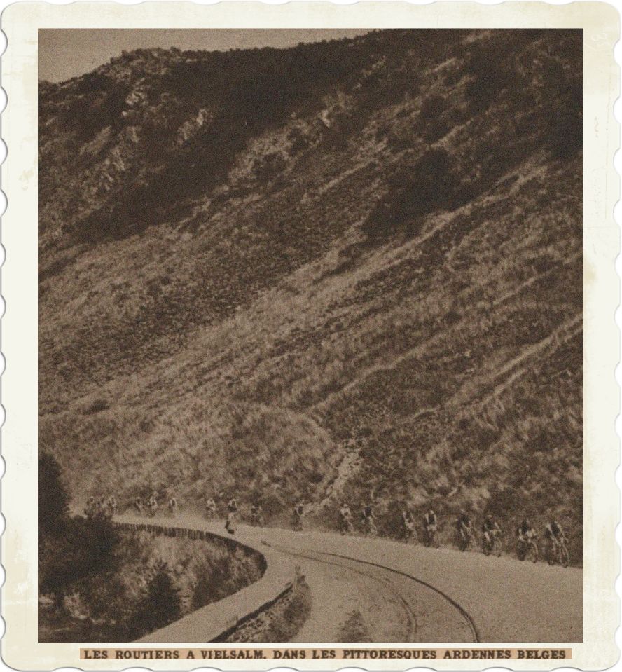 Reeds direct na de start begint de weg te stijgen tot voor Spa en dan krijgen wij de eerste klimpartij te zien, hier hebben wij over een afstand van plm. 6 km een stijging van 300 meter Deze geweldige berg werd het eerst genomen, door de Spanjaard Mariano Cañardo die hier plm 100 meter vóór was. Dan het hoofdpeloton met een Nederlander Bram Polak op kop. De Fransman Bisseren volgt op 100 Meter en dan de Zwitsers Heiri Suter en Georges Antenen op 600 meter Bram Polak en Joep Franssen! Het gaat nu berg af en na plm. 30 km krijgen wij den hoogste berg te nemen bij Baraque Fraiture. Wij hebben dan plm 80 km afgelegd. Even moeten wij opmerken, dat de Nederlander Jan v. d. Heijden na 30 km heeft moeten opgeven. (Wij vernamen, dat hij een lichte zonnesteek had bekomen). Later te Luik troffen wij hem in bed maakte hij het goed. Onze jongens, Joep Franssen en Bram Polak hadden tot op dat moment geen duim breed toegegeven en het was zelfs het rood wit blauwe tricot, dat zéér veel aan de kop ging! Juist op het moment dat wij de hoofdgroep verlieten om langs een tussenweg naar de voedings en contróle post te Marche te gaan, waar wij tijdig aanwezig moesten zijn werd het peloton door Franssen geleid. Grote mannen als Nic Frantz, Heiri Suter, Oscar Tierbach, e.a. zaten toen achter het peloton. Wij arriveerden inmiddels te Marche waar voor ieder land een lange tafel in gereedheid was gebracht. Wij hadden geen moeite onze plaats te vinden, spoedig hadden wij onze tafel in beslag genomen waarboven de Nederlandse driekleur wapperde, en de naam Nederland met 80 cm grote letters prijkte. Rechts van ons Frankrijk en links de Italiaanse verzorging. Wij hadden alles voor de komst van onze jongens in gereedheid gebracht. Wij wachtten nu vol spanning. Zouden de onzen er nog niet bij zijn ? Het duurde lang ! De massa mensen, die hier bij elkaar gekomen was, was enorm. Dan komen de officiële volgauto’s een luid gejuich gaat op. Ze komen ! Ze zijn met 11 man voorop. Zouden Joep Fransen en Bram Polak er nog bij zijn ? En Ja! op 50 meter voor de groep stuift de Belg Émile Joly binnen, dan een groep van 10 man, allen grote bekenden, en bij die grote bekenden één rood-wit-blauwe trui. Joep ! Joep ! klonk het van vele kanten. Alle handen hielpen. De spanning steeg ten top. Wat vonden wij op dit moment dezen eenvoudige jongen uit Ubachsberg een grote kerel!