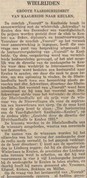 De renclub „Vooruit” te Kaalheide houdt in samenwerking met de wielerclub „Schwalbe” te Keulen de 4e December een vaardigheidsrit. De prijzen worden gesteld door de club te Keulen: o.a. Beker, diploma’s en kunstvoorwerpen. Vooraleer de renclub „Vooruit” op het verzoek voor samenwerking is ingegaan, heeft die aanvrage een punt van bespreking uitgemaakt in de bestuursvergadering van „Vooruit” te Kaalheide. Op deze vergadering werd van verschillende bestuursleden gevraagd, of het niet mogelijk was de directie van de zesdaagse te Keulen voor deze wedstrijd te interesseren. Door het bestuur werd besloten een bestuurslid naar Keulen te zenden, om daar die zaak te gaan bezien, om een oplossing te vinden. In de Rheinlandhalle heeft toen een bespreking plaats gevonden met dhr. Schweitzer, directeur der Rheinlandhalle. Het voorstel van „Vooruit” werd hem uiteengezet en hij nam het voorstel aan. Dhr. Schweitzer stelde voor het volgende: de directie der Rheinlandhalle zet als prijs voor de winnaar van de Nieuwelingen als voor de Aspiranten een lauwerkrans met sjerp. Op de ene kant van de sjerp komt te staan: „Ter herinnering aan de Vaardigheidsrit Kaalheide—Keulen”, op de andere zijde: „Gesticht door de directie der Rheinhandhalle te Keulen 1932.” De kransen worden in de Rheinlandhalle aan de winnaars aangeboden, waarna een ereronde wordt gereden. De namen van de winnaars worden bij het uitzenden van het verslag der zesdaagse door de radio mede vermeld.