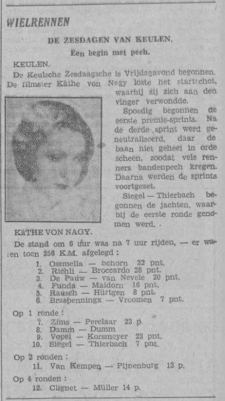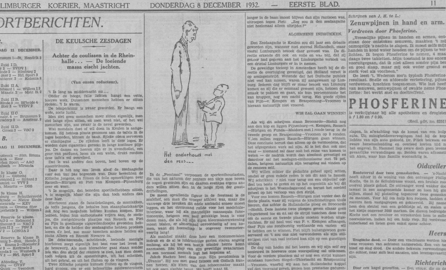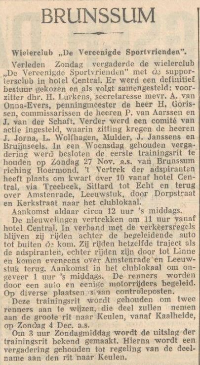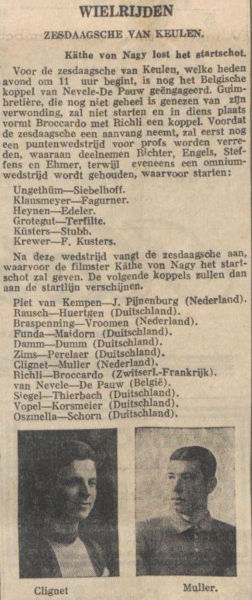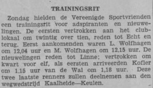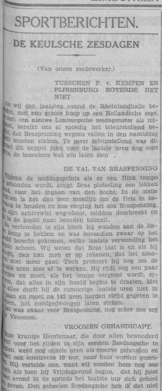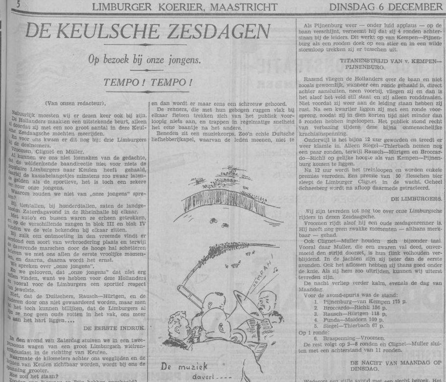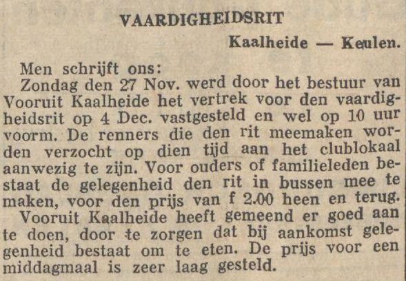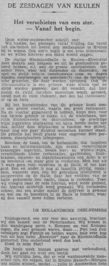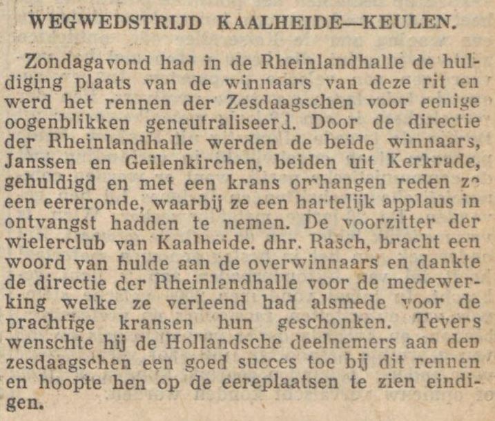 In het gesprek verklaarde de heer directeur: U kunt aan de sportvrienden in Limburg zeggen; dat hij als directeur der Wielerbaan te Keulen, de prestaties der Limburgse renners weet te schatten, en dat hij vast voornemens is vier a vijf Limburgse jongens bij de zesdaagse te Keulen te laten starten, en daarbij heeft hij namen genoemd als: Vroomen, Klignet, Kisters, Bokkum en Muller. Op de vraag van het bestuurslid van Vooruit of bovengenoemde renners al hadden gecontracteerd, werd hem geantwoord: Het was alleen nog maar een kwestie van getal, maar op vier konden de Limburgse sportvrienden vast rekenen. Op de vraag welke klasse van renners „Vooruit” wou laten starten, werd hem medegedeeld „nieuwelingen en aspiranten”. Dat heeft „Vooruit” menen te moeten doen om ook de jeugdige renners aan te moedigen. Voor de winnaars van beide groepen is zodoende kans om eer te behalen en naam te maken. De renclub „Vooruit” hoopt dat hun vertrouwen in Nieuwelingen en Aspiranten in Keulen niet beschaamd zal worden, en dat zij zullen tonen dat de Limburgse jongens kunnen rijden niet alleen in mooi, maar óók in slecht weer. Het traject van de wedstrijd loopt: Kaalheide, Herzogenrath, Alsdorf, Heugen, Julich, Bergheim, Keulen. Tot achter Herzogenrath is de wedstrijd geneutraliseerd en dienen de groepen bij elkaar te blijven. Tot Bergheim wordt gereden onder controle van „Vooruit” en vandaar tot aan de eindstreep neemt de Keulse club de controle over. Om verkeerd rijden te voorkomen is afgesproken, dat op elke hoek waar moet worden ingereden een renner van Keulen staat met een vlag, om den weg aan onzen jongens aan te geven. Mocht ’t zijn dat de renners na den wedstrijd het huldigingsfeest, aangeboden door de Keulse club, of de zesdaagse willen bij wonen, hun kleren bij het bestuur tezamen gebonden en met hun naam af geven, dan nemen de controle-auto’s die kleren mede naar Keulen. Met ’t oog op het publiek dat de wedstrijd tot Keulen zou willen volgen, is de volgende regeling getroffen. Tot en met 28 November kunnen diegenen die mede willen gaan hun eigen opgeven bij het rijwielmagazijn „Limburgia” H. Groothedde Kleingraverstraat Spekholzerhelde. Bij genoegzame deelname wordt door „Vooruit” gezorgd voor bussen aan normale prijs. Deze vaardigheidsrit is alleen voor nieuwelingen en aspiranten en deze moeten zich dan ook voor den 28ste November hebben opgegeven in ’t nieuwe clublokaal van „Vooruit” bij H. Dörr, Dahliastraat Kaalheide. Na den 28sten November worden geen aanmeldingen meer aangenomen, wegens het regelen van den rit.