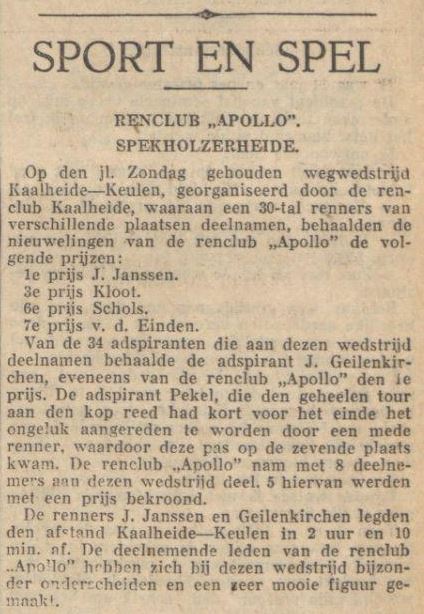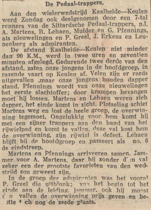 Bij de nieuwelingen toonde zich de renner Pfennings uit Sittard een renner met uitstekende kwaliteiten. Onophoudelijk rukte deze het peloton uit elkaar, zodat na 40 K.M. nog slechts 12 renners het hoofdpeloton vormden. Diverse valpartijen deden er zich voor. welke het peloton in 3 groepen splitste. In de eerste groep merken wij op Pex, Janssen, Schols, Reull, Janssen, v. d. Laan en Klot. Ongeveer 15 K.M. voor de finish ontmoeten wij een flinke helling, waar Janssen uit Kerkrade ontsnapt. Op 500 M. volgden Janssen en Kloot, daarachter Koffler, Pex en v. d. Laar. De strijd was nu voor goed ontbrand, Janssen hield alleen dapper stand en behield zijn voorsprong, alzo na juist 2 uur rijden als winnaar eindigende