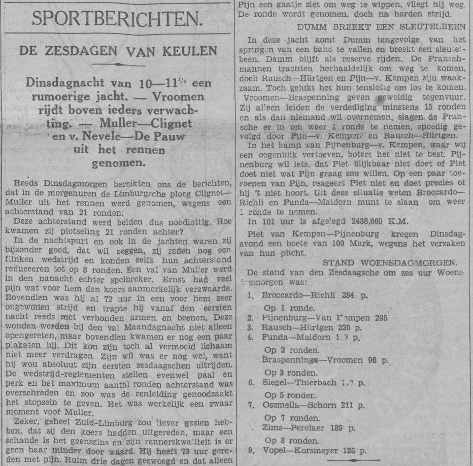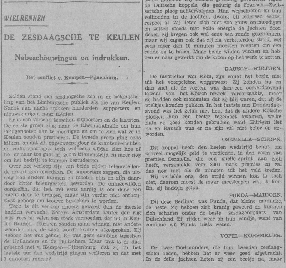 Eerst echter reden zoals reeds aangehaald de twee winnaars onder luide toejuichingen een ereronde. Hierna sprak dhr. H. Hasch uit Spekholzerheide door de microfoon enkele woordjes tot de Duitse sportvrienden. Daarna ging onze aandacht naar de Zesdagenmannen, in het bijzonder naar de Limburgers, waarbij wij opmerkten, dat Vroomen uitstekend reed, Clignet niet veel voor hem onderdeed en Müller door diverse valpartijen zeer gehandicapt was. Onnodig te zeggen, dat wij na zulk een lange en zware dagtaak naar huis verlangden, waar wij pas om 4 uur een verdiende rust vonden.