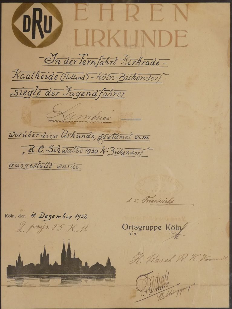 Ik kwam laatste weer in contact met Roger Peusmans, als amateur reed hij nog bij TWC Maastricht, ik was zijn ploegleider destijds. Roger is een achterneef van Jan Lambrichs en drijft samen met zijn vrouw Sandra een goed geoutilleerde rijwielzaak aan de St. Pieterstraat 59 in Kerkrade: Tweewielers Bisschops, CUBE is zijn merk. Hij beheert het “Lambrichs archief”. Daarin trof ik bijgaande “DRU Ere Oorkonde” aan, voor mij een reden voor nader onderzoek naar deze koers en Jan Lambrichs’ anekdote over de “Fernfahrt Kerkrade/Kaalheide – Köln/Birkendorf, gr pk