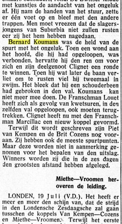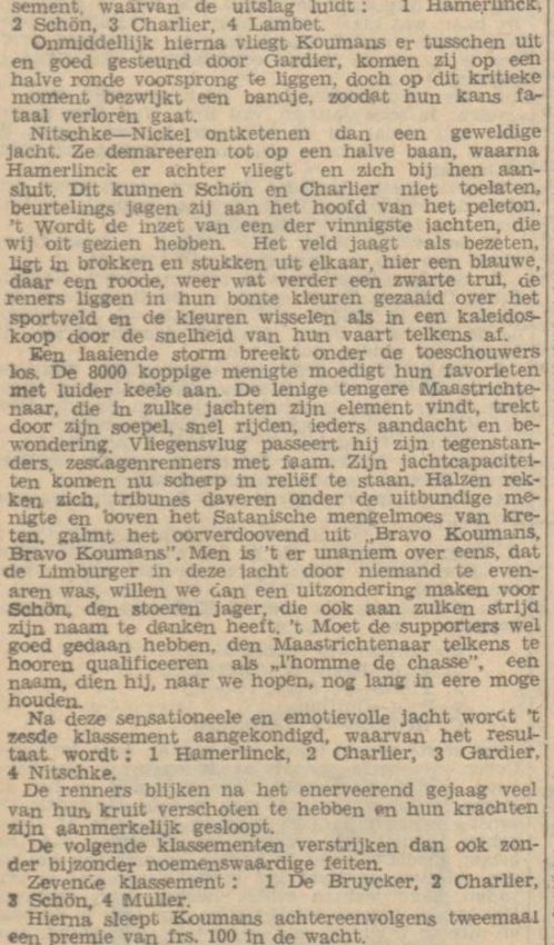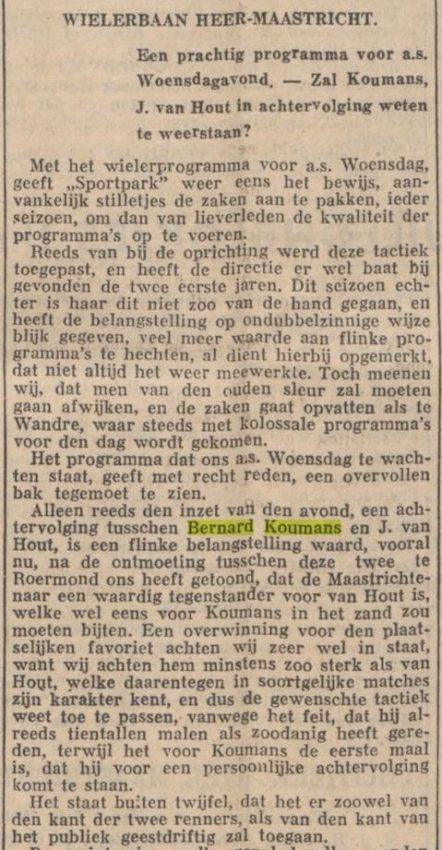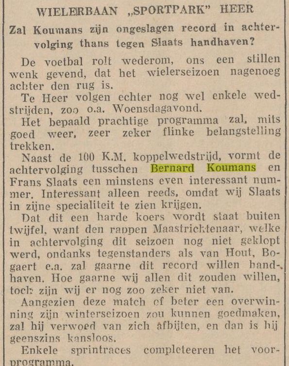 Oordelend naar zijn fikse sprongen valt daar wel iets voor te zeggen, doch onze renners rijden te weinig sprintmatchen om hierin bedreven te zijn. Dat is ook met Koumans het geval. Bovendien zijn daarvoor allereerst stalen zenuwen nodig, en komt daar heel wat tactiek bij kijken. Tegen de snelste renners behoeft hij geen slecht figuur te slaan, doch nervositeit en vooral gemis aan voldoende sprintersroutine spelen hem grote parten. Zo o.a. in de finale van den sprint bij de opening te Heer. Op handige wijze wist hij zich, met Van Hoek op kop, tussen deze en Joep Clignet te nestelen. Deze laatste, een renner, als geknipt voor zulke wedstrijden, wipte onverwachts en onhoudbaar laar de leiding en Koumans geraakte in derde en laatste positie. Toen reeds voorspelden wij hem de 3e plaats, hoewel hij van kop, de sprint inzettend, evengoed had kunnen winnen. Dit bewees hij trouwens in de koppelrace, toen hij op overtuigende wijze het 1e klassement won, om daarna door Schorn niet meer in de gelegenheid gesteld te worden, zich daarin met zijn tegenstander te meten. Zijn partner Schorn heeft, gezien de kwaliteiten als van zo’n renner, veel afbrekend werk verricht. Had deze zijn best gedaan, wellicht werd de eerste wedstrijd reeds een overwinning voor Koumans, die beduidend beter reed dan zijn partner. Doch in de toekomst krijgt hij gelegenheid te over om zijn kunnen te tonen, daar hij aardig wat contracten afsloot, o.a. met Heer, Kerkrade, Roermond, Verviers, enz. Nog kunnen we aanhalen, dat Koumans was aangezocht, om in de 9 uur koppelwedstrijd op de winterbaan te Keulen uit te komen, doch zoals men weet, wees hij dit aanbod van de hand, omdat hij reeds lang zijn training op de winterbaan staakte en bovendien de verdiensten voor zulk een monsterrace veel te gering bleken.