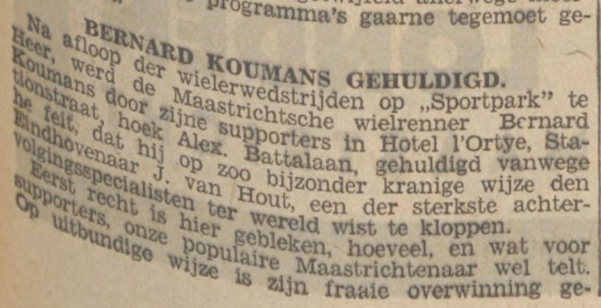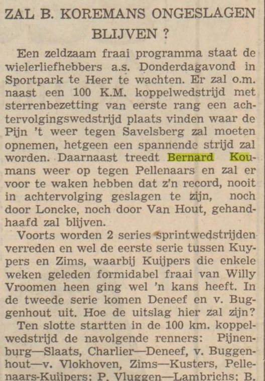 Te beginnen met BERNARD KOUMANS moeten wij, en ongetwijfeld velen met ons, onmiddellijk onzen spijt uitdrukken, dat deze na het afsterven van de wielerbaan te Amby, zich uit de beweging terugtrok, ondanks het feit, dat deze toen op 17-jarigen leeftijd, tot de beste renners van Nederland uit zijn categorie behoorde. Voortdoen had toen voor hem geen zin meer, daar hij geheel ingesteld was op het baanrijden, en zijn fietswijze nu niet bepaald paste bij het kader der routiers, en vooral omdat hem de weg niet aanstond.