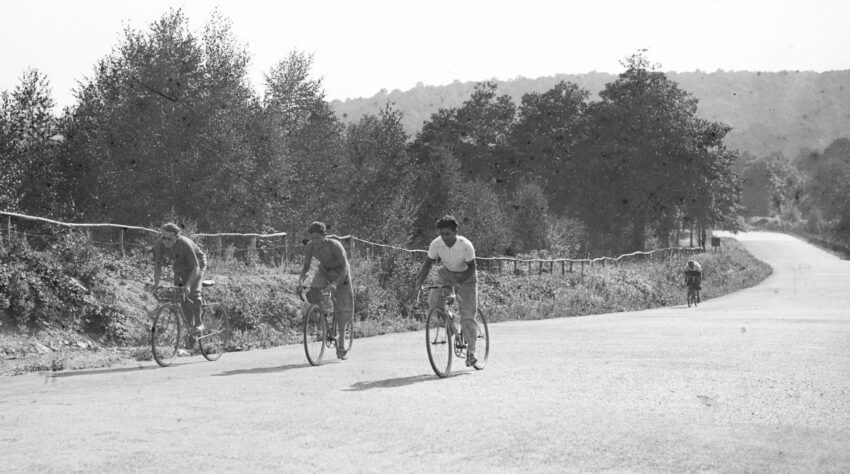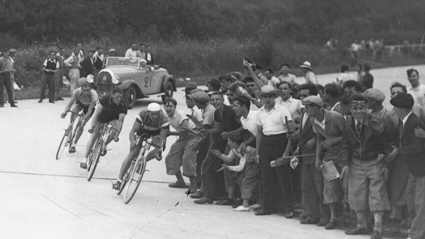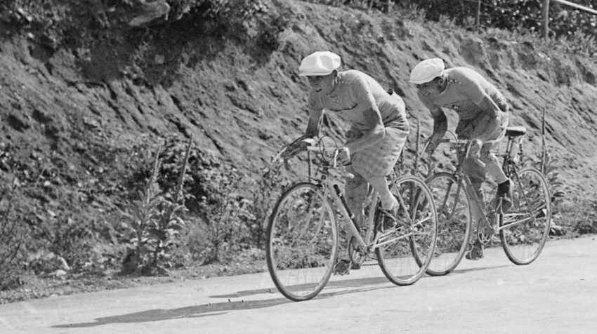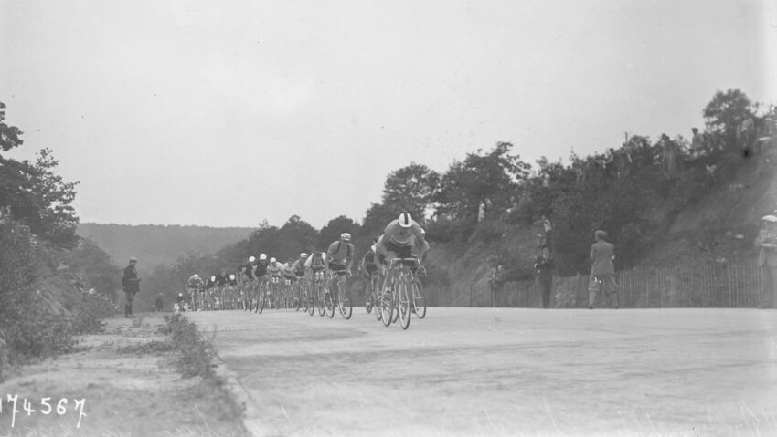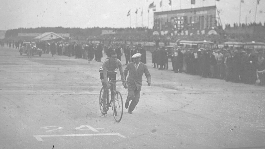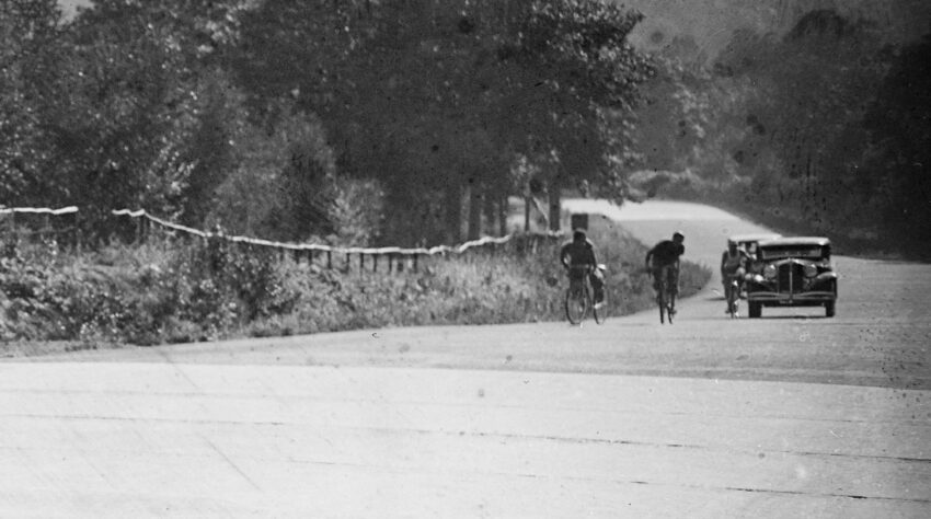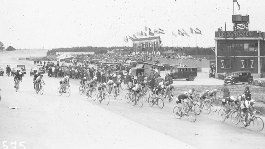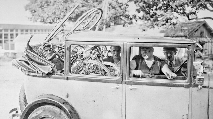 De Nederlandse ploeg, die aankomt op het circuit van Monthléry, zo’n 40 km van Parijs, om het 12,5 km lange parcours te verkennen van het aanstaande wereldkampioenschap op maandag 14 augustus 1933. Achter in de auto zien we Marinus Valentijn die uiteindelijk met de bronzen medaille op het podium stond naast de nieuwe wereldkampioen Georges Speicher en zilveren Antonin Magne. In het midden Gerrit van Ruit die eindigde op een verdienstelijke 9e plaats. Rechtsachter in de auto “niet bepaald comfortabel” verscholen tussen de koersfietsen de derde Nederlandse deelnemer Thijs van Oers, die in de 8e ronde met pech aan z’n derailleur zou uitvallen. Voorin de auto de Nederlandse begeleiders, met sigaret de voormalig wielerkampioen/verzorger Guus Schilling en ernaast ploegleider/journalist Joris van den Bergh.