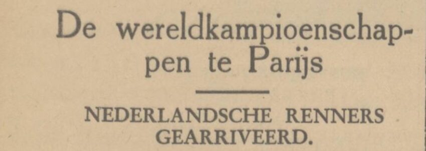 Met de namiddagtrein zijn Maandag, onder leiding van den heer Swaab de Beer twaalf Nederlandsche renners te Parijs gearriveerd, welke aan de wereldkampioenschappen zullen deelnemen. De renners zijn ingecheckt in een nieuw hotel vlak bij het Parc des Princes en kunnen dinsdag onmiddellijk gaan trainen. De wegrenners blijven in hetzelfde hotel en gaan morgenmiddag naar MontIhéry, op ongeveer 40 kilometer van Parijs gelegen. Heen en terug met een rit op de baan van 12,5 km, betekent dit dus een kleine honderd kilometer als training. Het traject dat verreden zal moeten worden is zeer zwaar, daar de wegrenners een traject van 12,5 km, het circuit van Monthlery, te berijden hebben, waarin zich een heuvel bevindt van ongeveer 300 m lengte, waarvan de laatste 50 m. zeer steil zijn. De beroepsrenners moeten dit traject 20 maal moeten doen. De course zal dus zwaar en tevens snel zijn.