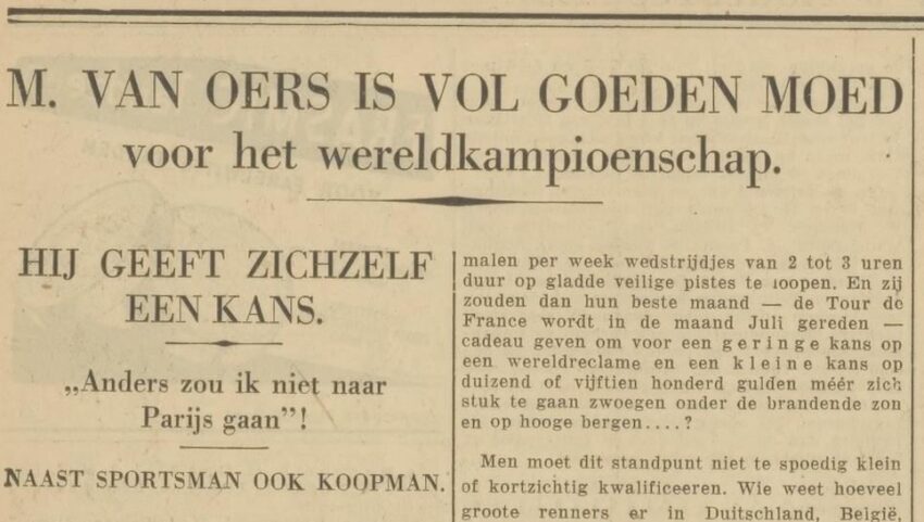 Van de drie Nederlandsche profs, die Nederland vertegenwoordigen op het WK is Mathijs van Oers uit Zevenbergen verreweg de snelste. Joris van den Berg noemt hem een stuk vuurwerk met sprongen en ontploffingen en met een sprint die voor elkeen gevaarlijk is. Welk tempo zij hem ook voorleggen: hij draait het lustig mee. Maar de eerste vraag is, hoe staat hij tegenover de beklimming en ten tweede, zou de afstand hem niet wat lang zijn? Een traject van 250 km is feitelijk 50 km te lang voor hem. Doch een wereldkampioenschap brengt velen tot voorheen nog nimmer bereikte prestaties. In de sprint achten wij onze nationaal kampioen Thijs van Oers zelfs tegen Binda en Hamerlinck opgewassen.