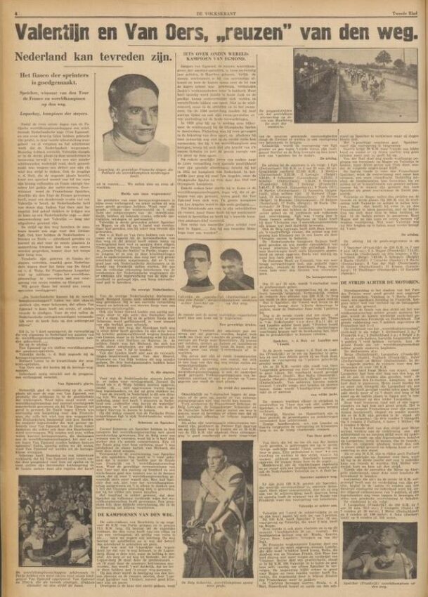 Wat tenslotte de koers van Speicher aangaat, aangemoedigd door de tienduizenden koerste hij voor een groot deel van den afstand alleen over de weg. Hij vergrootte steeds meer zijn voorsprong en won op magnifieke wijze. Zoals van Jaap van Egmond beslag legde op de Olympische titel en eerder deze week de wereldtitel, zo won Georges Speicher de twee belangrijkste titels der beroepsrenners, n.l. winnaar van de Tour de France en wereldkampioen. Het behoeft geen verwondering te wekken dat het gejubel der toeschouwers geen grenzen kende.