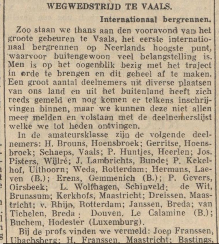 Zo slaan we thans aan de vooravond van het grote gebeuren te Vaals, het eerste internationaal bergrennen op Neerlands hoogste punt, waarvoor buitengewoon veel belangstelling is. Men is op het ogenblik bezig met het traject in orde te brengen en dit geheel af te maken. Een groot aantal deelnemers uit diverse plaatsen van ons land en uit het buitenland heeft zich reeds gemeld en nog komen er telkens inschrijvingen binnen, maar we kunnen deze niet allen meer melden en volstaan met de deelnemerslijst welke we tot heden ontvingen.