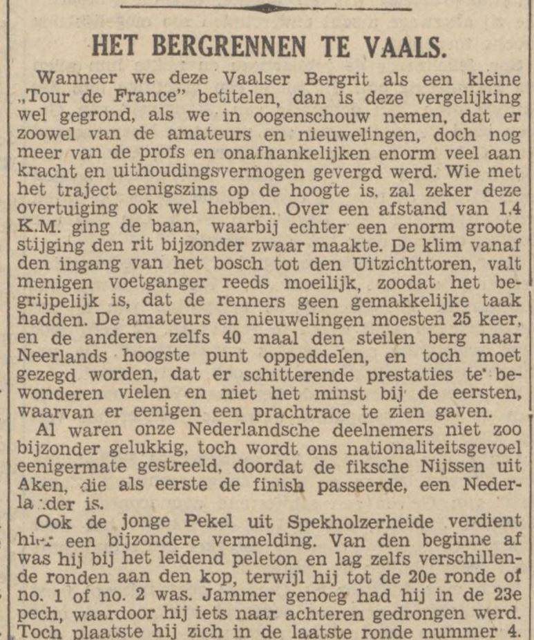 Ook de jonge R. Pekel uit Spekholzerheide verdient hier een bijzondere vermelding. Vanaf het begin af was hij bij het leidend peloton en lag zelfs verschillende ronden aan den kop, terwijl hij tot de 20e ronde of no. 1 of no. 2 was. Jammer genoeg had hij in de 23e pech, waardoor hij iets naar achteren gedrongen werd. Toch plaatste hij zich in de laatste ronde nummer 4. Een felle eindspurt bestond er tussen Hermans (Montzen) en Scheen (Busbach) om de tweede en derde plaats. Nijssen handhaafde zijn voorsprong, dien hij vanaf de 20e ronde uit de vierde positie wist te halen, terwijl Scheen de tweede plaats moest afstaan aan Hermans.