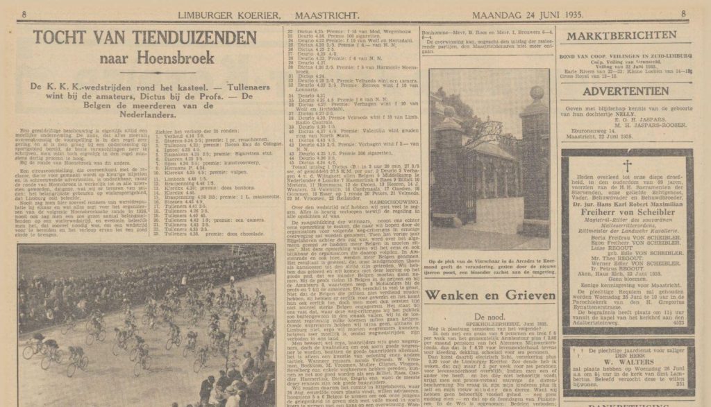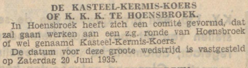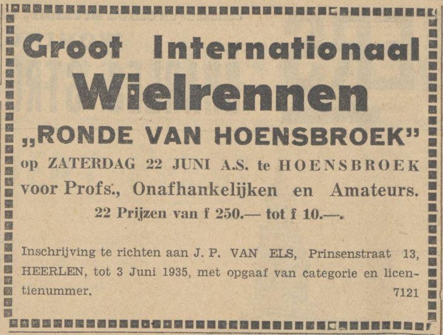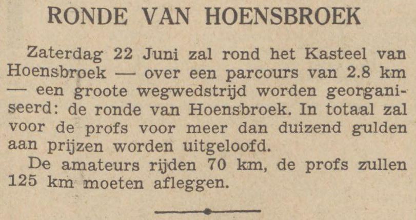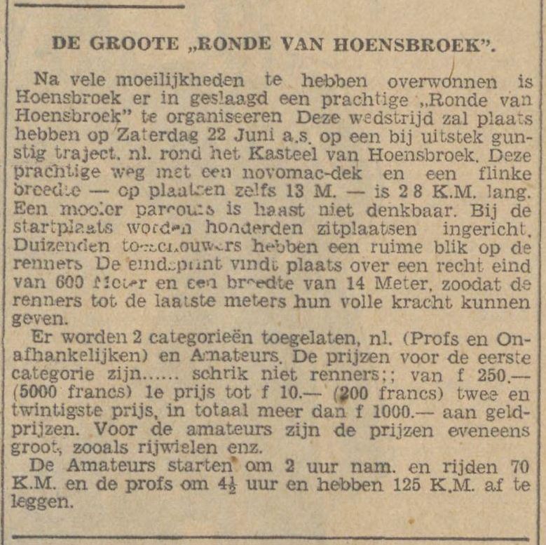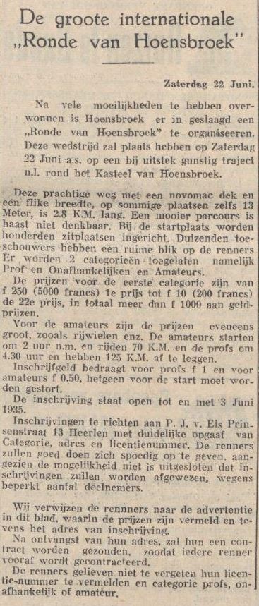 Na vele moeilijkheden te hebben overwonnen is Hoensbroek er in geslaagd een „Ronde van Hoensbroek” te organiseren. Deze wedstrijd zal plaats hebben op Zaterdag 22 Juni a.s. op een bij uitstek gunstig traject n.l. rond het Kasteel van Hoensbroek. Deze prachtige weg met een novomac dek en een flinke breedte, op sommige plaatsen zelfs 13 Meter, is 2.8 K.M. lang. Een mooier parcours is haast niet denkbaar. Bij de startplaats worden honderden zitplaatsen ingericht. Duizenden toeschouwers hebben een ruime blik op de renners. Er worden 2 categorieën toegelaten namelijk Prof & Onafhankelijken en Amateurs. De prijzen voor de eerste categorie zijn van f 250 (5000 francs) 1e prijs tot f 10 (200 francs) de 22e prijs, in totaal meer dan f 1000 aan geldprijzen. Voor de amateurs zijn de prijzen eveneens groot, zoals rijwielen enz. De amateurs starten om 2 uur n.m. en rijden 70 K.M. en de profs om 4.30 uur en hebben 125 K.M. af te leggen. Inschrijfgeld bedraagt voor profs f 1 en voor amateurs f 0.50, hetgeen voor de start moet worden gestort. De inschrijving staat open tot en met 3 Juni 1935. Inschrijvingen te richten aan P.J. van Els Prinsenstraat 13 Heerlen met duidelijke opgaaf van Categorie, adres en licentienummer. De renners zullen goed doen zich spoedig op te geven, aangezien de mogelijkheid niet is uitgesloten dat inschrijvingen zullen worden afgewezen, wegens beperkt aantal deelnemers. Wij verwijzen de renners naar de advertentie in dit blad, waarin de prijzen zijn vermeld en tevens het adres van inschrijving. Na ontvangst van hun adres, zal hun een contract worden gezonden, zodat iedere renner vooraf wordt gecontracteerd. De renners gelieven niet te vergeten hun licentie-nummer te vermelden en categorie profs, onafhankelijk of amateur.