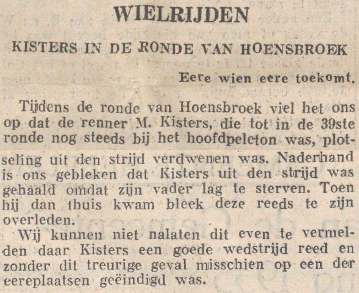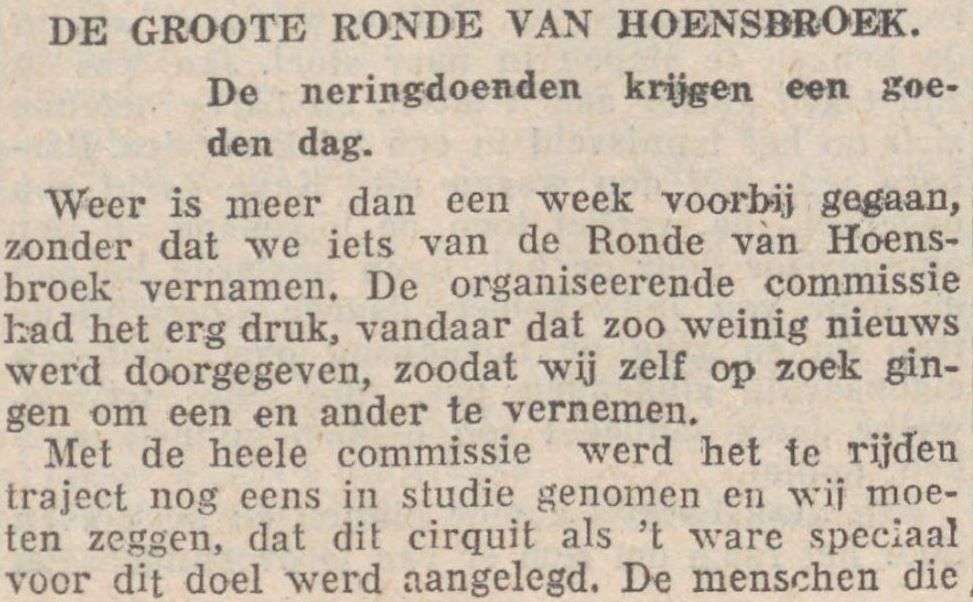 Thans staan wij aan de vooravond van een groot wielergebeuren. Groter dan ooit in Limburg of Nederland werd georganiseerd. Ook belangstelling voor dezen wedstrijd bleef niet in een klein kringetje rondom Hoensbroek, doch de naam K.K.K. werd de laatste dagen ook besproken tot ver over onze grenzen.