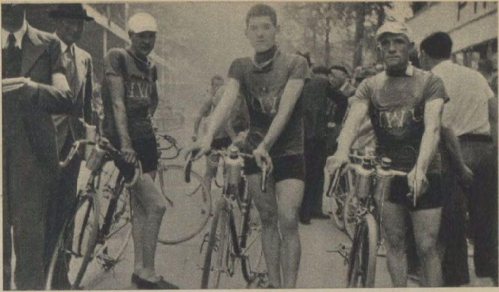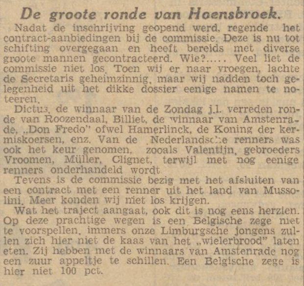 Dictus, de winnaar van de Zondag j.l. verreden ronde van Roozendaal, Billiet, de winnaar van Amstenrade, „Don Fredo” ofwel Haemerlinck, de Koning der kermiskoersen, enz. Van de Nederlandsche renners was ook het keur genomen, zoals Valentijn, gebroeders Vroomen, Muller. Clignet, terwijl met nog eenige renners onderhandeld wordt
