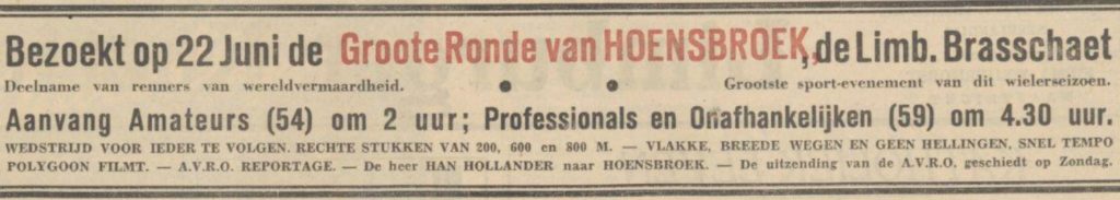 Het is gelukt dhr. Han Hollander, de bekende sportreporter van de A.V.R.O. bereid te vinden de microfoon te bedienen. De wedstrijd zal tevens worden opgenomen op grammofoonplaten, welke na afloop en des Zondags door de A.V.R.O. ten gehore zullen worden gebracht. Verder komt de filmmaatschappij Polygoon om de “K.K K.” te verfilmen, zodat het verloop van den wedstrijd enkele dagen na afloop, op het witte doek kan worden gehoord en gezien. Men ziet dus dat de organisators niets hebben nagelaten om den K. K. K. tot een der beste wedstrijden te maken, die ooit in Limburg werden gehouden.