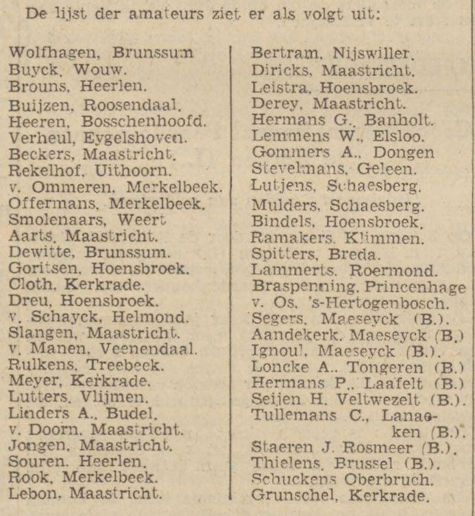 De uitslag van de amateurs luidde: 1. A.Tulleners B in 1 uur 54 min. 2. J.Staeren B op 35 sec 3. H.Seyen, Maastricht, op 1 lengte. 4. P.Hermans B. 5. M.Ignoul B. 6. N.Slangen. 7. F.Lammerts 8. A.Heeren. 9. P.Segers B. 10.G. Tielens B. 11.W. Buysen. 12.Frederiks. 13.Jongen. 14.de Witte. 15.Clerx.