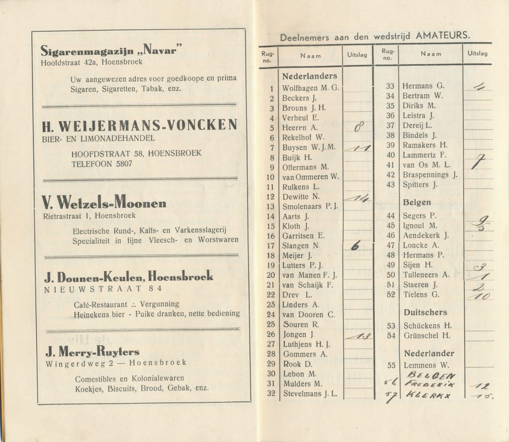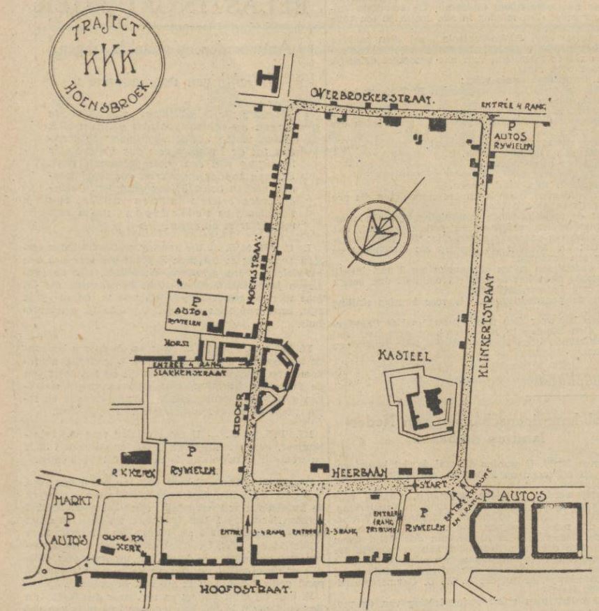Reeds bij onze eerste berichten hebben wij vermeld. dat het uitgezochte circuit zich bij uitstek leende voor een dergelijke koers. De lengte van het parcours is 2800 meter lopende over snelle novomac- en macadamwegen, met vier zeer goed te nemen bochten. De start en finish liggen op een 600 meter recht stuk met een breedte van 13 meter.. zodat ieder renner zich volkomen kan geven in premie- en eindspurt. Zodra zij de finish voorbij zijn volgt op 100 meter een zeer grote bocht, met een spiraal breedte van 40 meter. Weer 100 meter voorbij deze bocht is een grote ruimte voor de verzorging der renners, hetgeen uitsluitend op deze plaats is toegestaan. In het traject zijn twee, voor een renner onbeduidende hellingen. In de Overbroekstraat, waar de weg het smals is, namelijk 4 a 5 meter, wordt, geen publiek toegelaten; dit met het oog op het gevaar voor de renners. In de bocht voor de Heerbaan, plusminus 600 meter voor de finish, staat “Janssen met de witte vlag”, die de renners de premies zal aankondigen. Op de Heerbaan, tegenover de finish, zijn grote tribunes opgebouwd, waarop ongeveer 1000 personen kunnen plaats nemen. Nabij deze plaats zal door twee muziekkorpsen, nl. de “Harmonie” van Hoensbroek en het muziekkorps van de Staatsmijn Emma worden geconcerteerd. Het verloop van den wedstrijd wordt doorlopend bekend gemaakt door middel van 6 grote en enkele kleine luidsprekers. De controle is zo scherp georganiseerd, dat onregelmatigheden uitgesloten moeten worden geacht. Over het gehele traject zijn geheime controleurs, speciale boetecommissarissen, verzorginscontrole enz. terwijl voor iedere 2 renners een rondeteller is aangewezen met speciale ronde-tel-staten. Deze controleurs zitten op een verhoging, zodat zij de deelnemer tot 100 meter kunnen volgen. Deze methode is onmisbaar gebleken, aangezien het meermalen is voorgekomen dat renners 1 of meer ronden uit de strijd bleven. Verder zijn voor de regeling van het verkeer 60 politieambtenaren aanwezig, benevens een groot aantal padvinders. Men ziet hieruit, dat de regeling van de wedstrijd zeer goed is verzorgd. Groote parkeerplaatsen zijn rondom het parcours in ruime mate aanwezig.