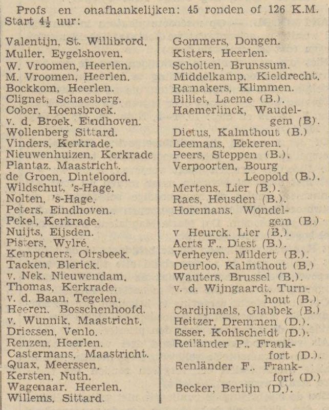 Profs en onafhankelijken. Valentijn is een onzer meest bekende wegrenners, die ook in deze koers een der beste van de onzen zal zijn. Toch gaat onze hoop nog meer uit naar onze Limburgers, nl.: W. Vroomen, Clignet, M. Vroomen, Bockkom, Muller, van Wunnik, enz. Juist het bijna geheel vlakke traject, komt ten goede aan de snelle renners, waar de kracht der Belgen veel zal worden tegengegaan. Ook de afstand nl. 126 km ligt juist in de lijn van onze baanrijders die ook reeds voorheen hebben getoond de wegwedstrijden onder de knie te hebben. Volgens aan ons verstrekte gegevens mogen wij ook den naam noemen van Middelkamp. Deze renner is woonachtig in België, doch is Nederlander, die zich speciaal toelegt op wegwedstrijden en criteriums en daarin zeer goede plaatsen heeft bezet tegen de beste Belgen.