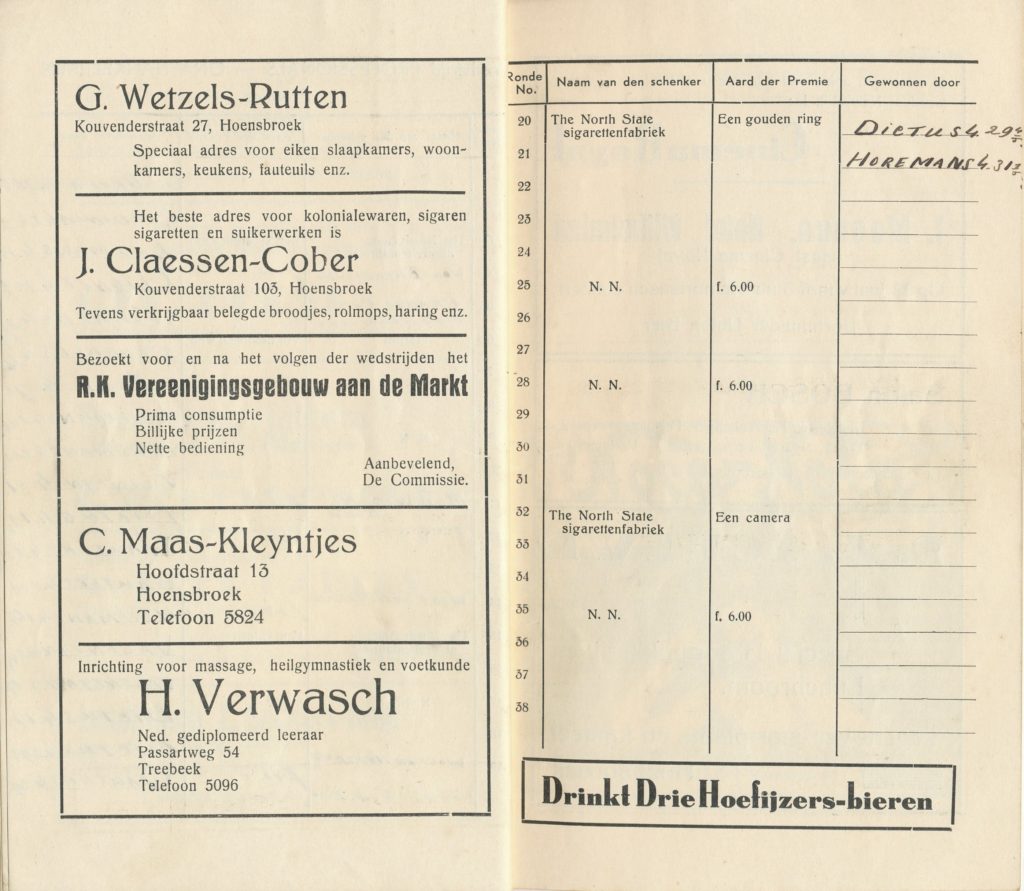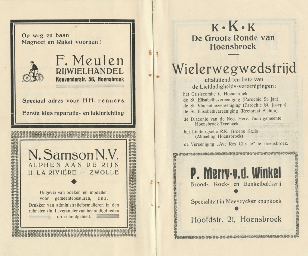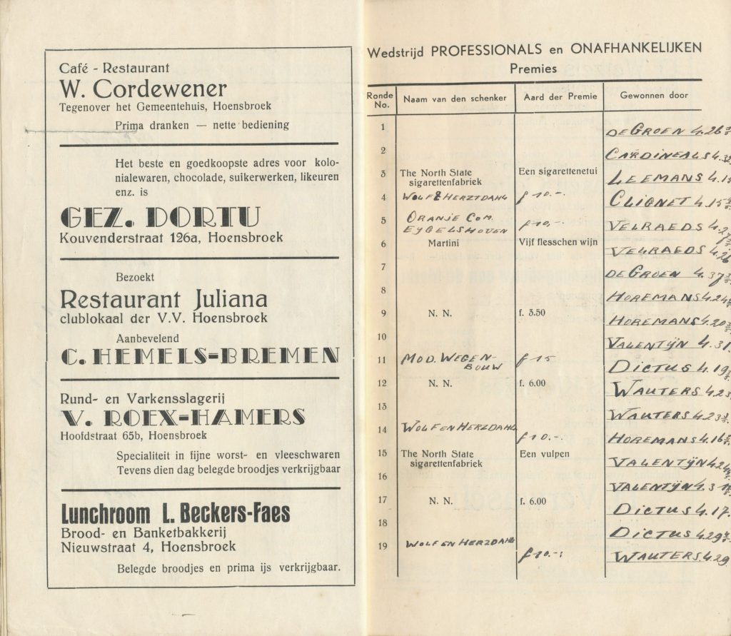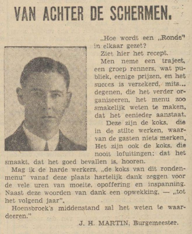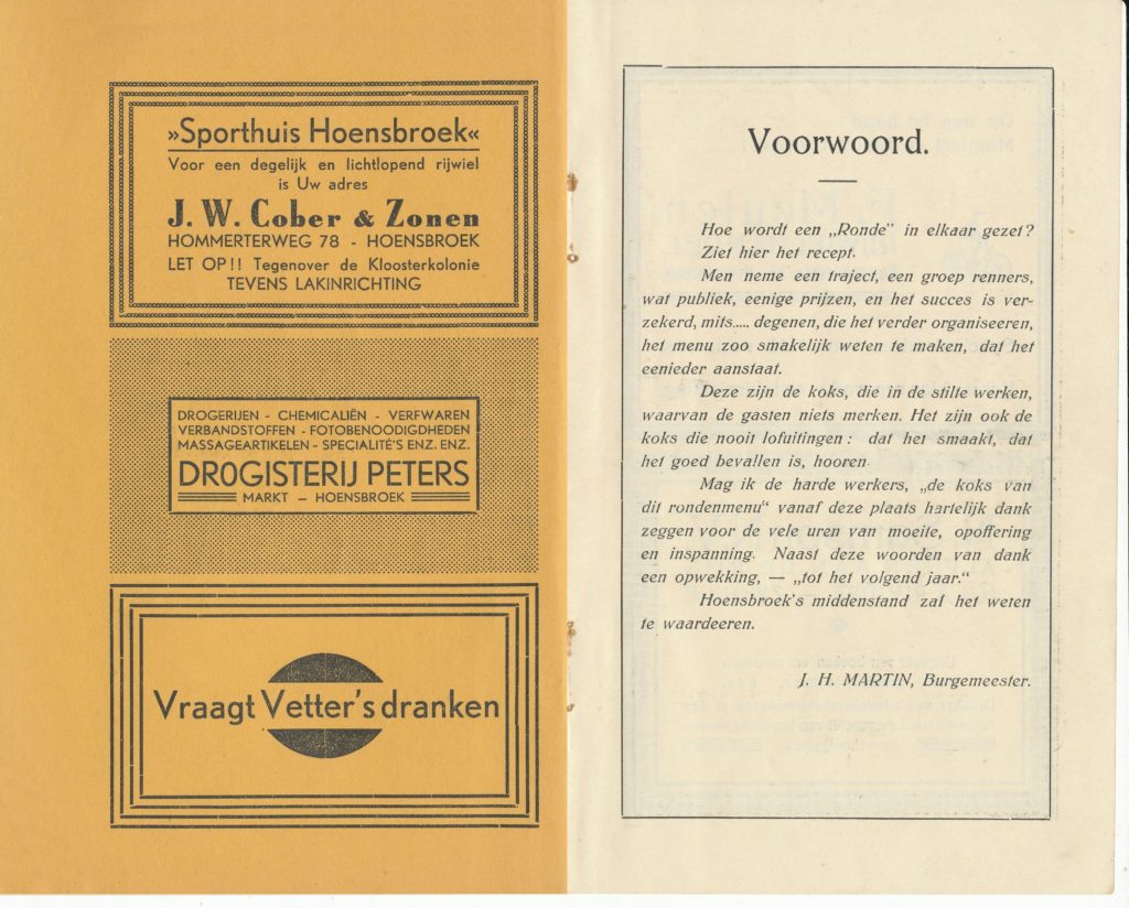 VAN ACHTER DE SCHERMEN. „Hoe wordt een „Ronde in elkaar gezet? Ziet hier het recept. Men neme een traject, een groep renners, wat publiek, enige prijzen, en het succes is verzekerd, mits… degenen, die het verder organiseren, het menu zo smakelijk weten te maken, dat het eenieder aanstaat. Deze zijn de koks, die in de stilte werken, waarvan de gasten niets merken. Het zijn ook de koks, die nooit lof uitingen: dat het smaakt, dat het goed bevallen is horen. Mag ik de harde werkers, „de koks van dit rondenmenu” vanaf deze plaats hartelijk dank zeggen voor de vele uren van moeite, opoffering en inspanning. Naast deze woorden van dank een opwekking, „tot het volgend jaar”. Hoensbroek’s middenstand zal het weten te waarderen.” H. MARTIN, Burgemeester.