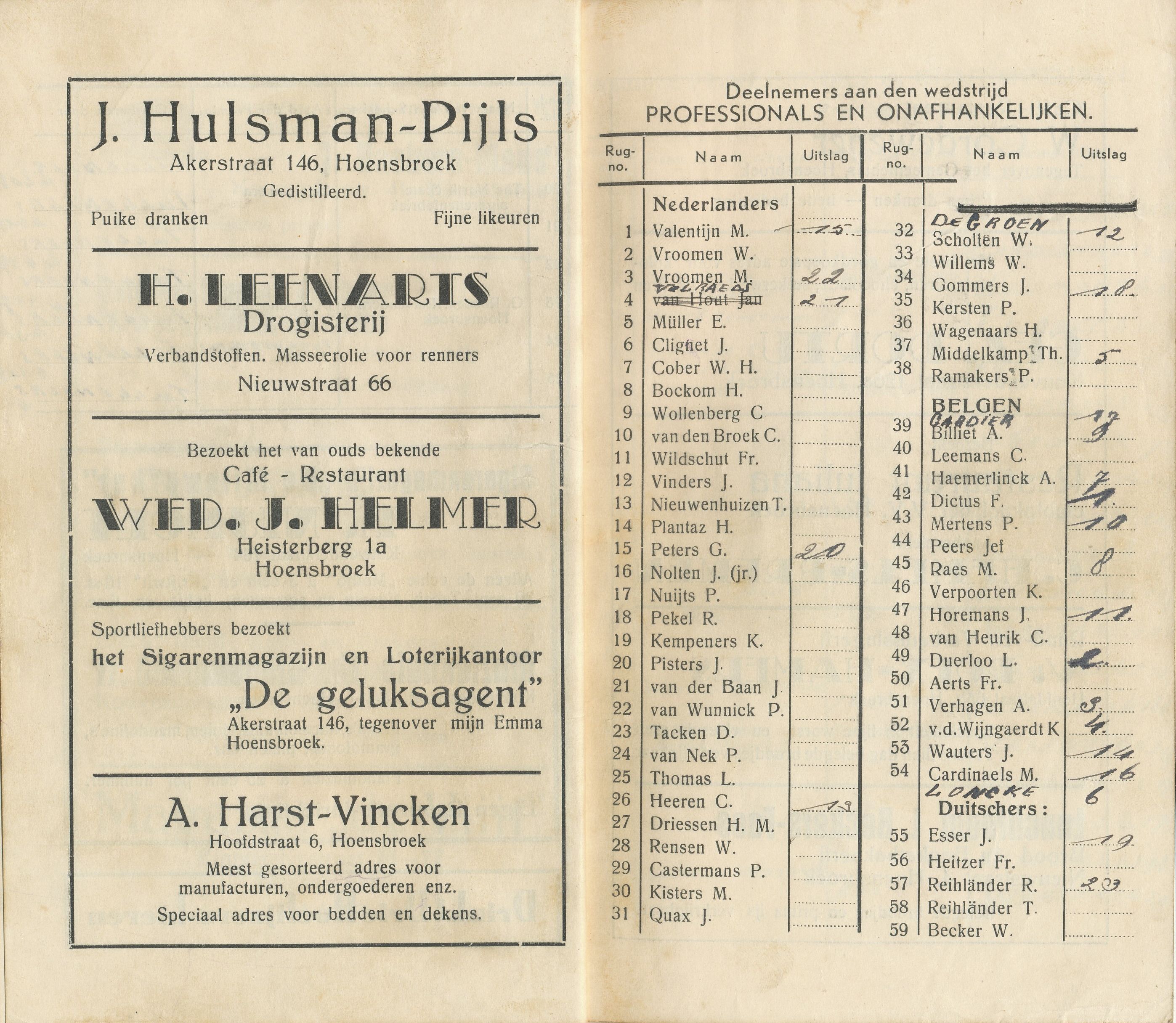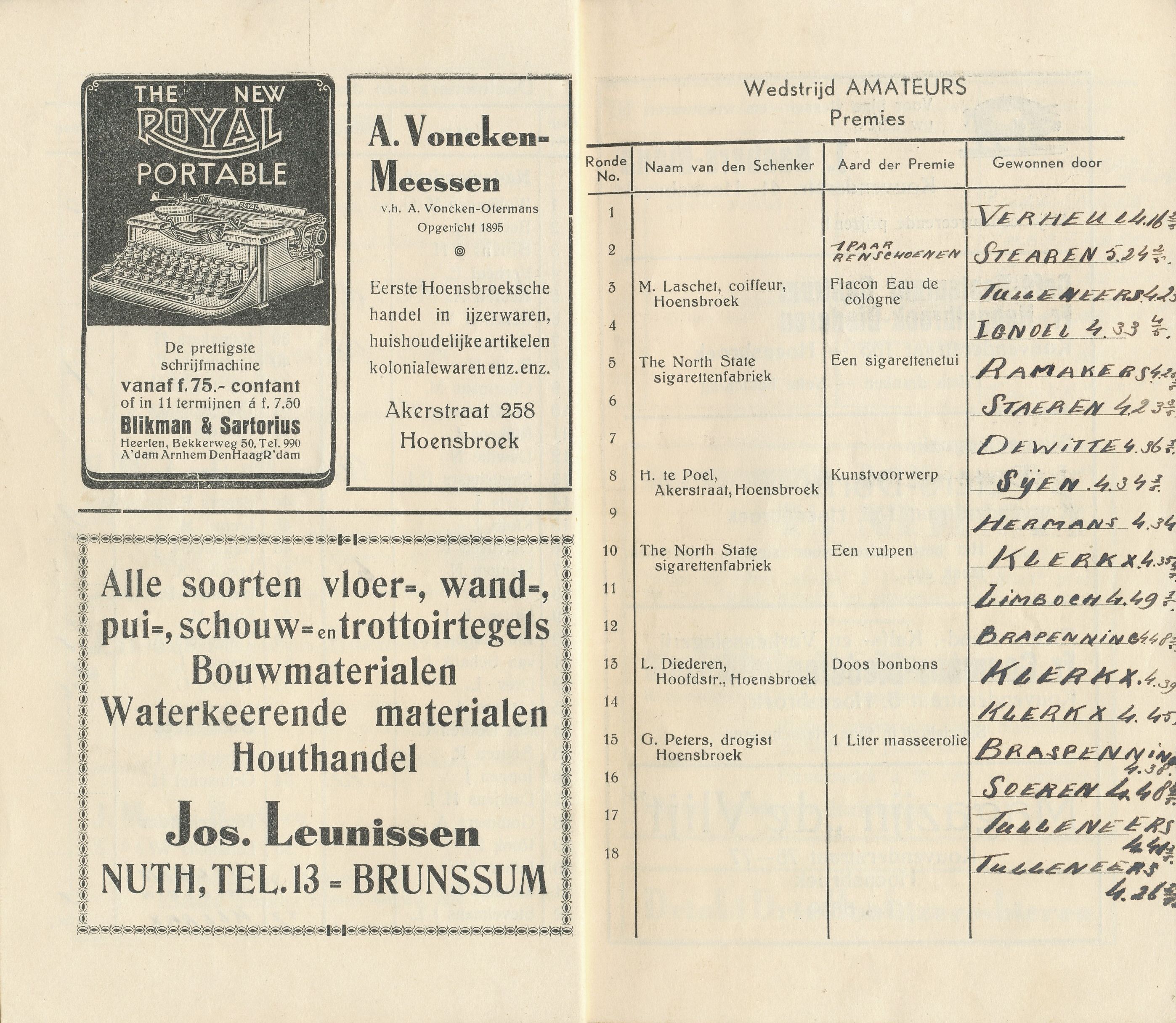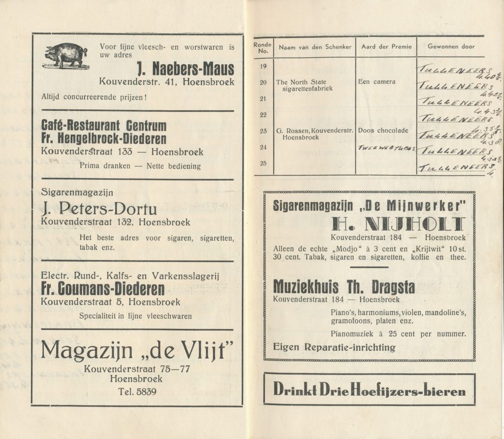 VAN ACHTER DE SCHERMEN. „Hoe wordt een „Ronde in elkaar gezet? Ziet hier het recept. Men neme een traject, een groep renners, wat publiek, enige prijzen, en het succes is verzekerd, mits… degenen, die het verder organiseren, het menu zo smakelijk weten te maken, dat het eenieder aanstaat. Deze zijn de koks, die in de stilte werken, waarvan de gasten niets merken. Het zijn ook de koks, die nooit lof uitingen: dat het smaakt, dat het goed bevallen is horen. Mag ik de harde werkers, „de koks van dit rondenmenu” vanaf deze plaats hartelijk dank zeggen voor de vele uren van moeite, opoffering en inspanning. Naast deze woorden van dank een opwekking, „tot het volgend jaar”. Hoensbroek’s middenstand zal het weten te waarderen.” H. MARTIN, Burgemeester.