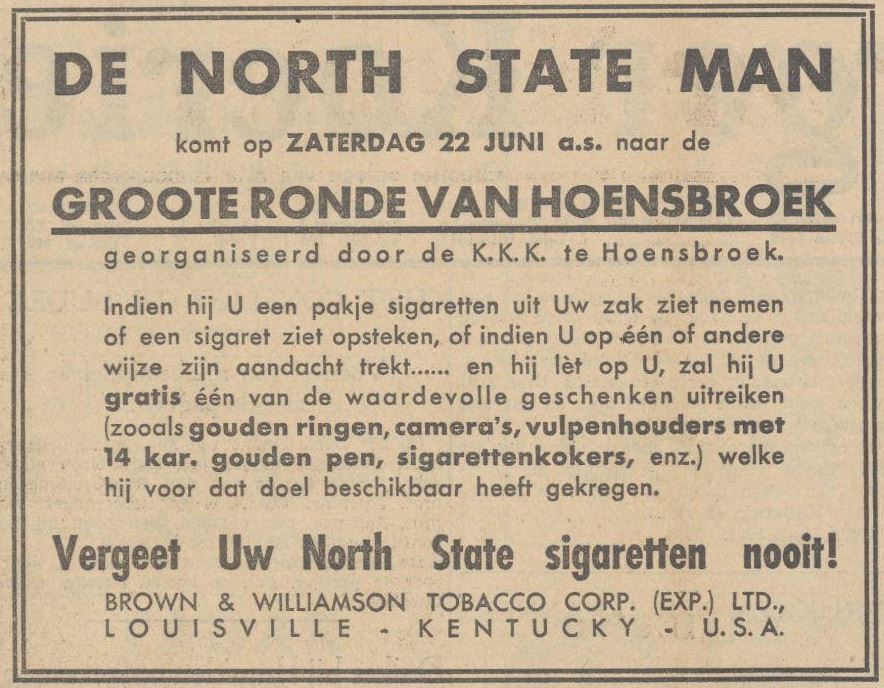 Bij de profs zowel als bij de amateurs, zijn tot heden per 2 en 3 ronden vaste premies, waarbij als voornaamste premie 2 diamanten ringen (van de North State sigaretten). Verder: geldpremies. fototoestellen, vulpennen, enz. enz. Niet alleen de renners, maar ook het publiek zal met premies worden verrast. De bekende North-Stateman zal zich tussen het publiek begeven, om aldaar rijkelijk te doen blijken van de mildheid der fabriek-directie.