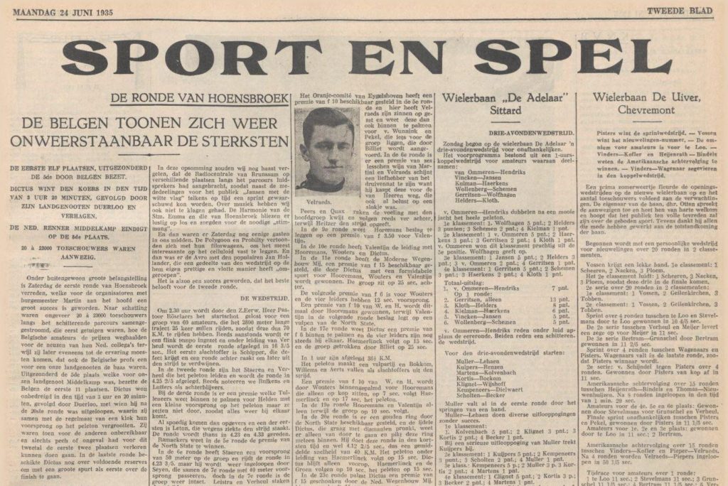 Onder buitengewoon grote belangstelling is Zaterdag de eerste ronde van Hoensbroek verreden, welke voor de organisatoren met burgemeester Martin aan het hoofd een groot succes is geworden. Naar schatting waren ongeveer 20 a 23000 toeschouwers langs het schitterende parcours samengestroomd, die eerst getuigen waren, hoe de Belgische amateurs de prijzen weghaalden voor de neuzen van hun Nederlandse collega’s terwijl zij later eveneens tot de ervaring moesten komen, dat ook de Belgische profs een voor een onze landgenoten de baas waren. Uitgezonderd de 5de plaats welke voor onzen landgenoot Middelkamp was, bezette de Belgen de eerste 11 plaatsen. Dictus won onbedreigd in den tijd van 3 uur en 20 minuten, gevolgd door Duerloo, met wie hij na de 20ste ronde was uitgelopen, waarin zij samen met de regelmaat van een klok hun voorsprong op het peloton vergrootten. Zij waren toen voor de anderen onbereikbaar en slechts pech of ongeval had voor dit tweetal de eerste twee plaatsen verloren kunnen doen gaan. In de laatste ronde beschikte Dictus nog over voldoende reserves om met een grote spurt als eerste over de finish te gaan. De prestaties van de Ned. profs doen daartegenover wel wat min aan, maar daarbij mag niet uit het oog worden verloren dat de meesten hunner als zuivere pistiers den strijd moesten aanbinden tegen mannen van de weg. De 5de plaats werd zoals gezegd door Middelkamp, waarna de Groen en Heere op de 12e en 13e plaats volgden, terwijl Valentijn als no. 14 arriveerde. Onze Limburgse jongens is het dezen koers niet voor den wind gegaan. Ofschoon zij goed het tempo tot het einde hebben volgehouden — er werd zeer snel gereden — konden zij het tegen het geroutineerde rijden van de Belgen niet bolwerken en moesten zij zich ten slotte met de laatste plaatsen tevreden stellen. Vluggen, W. Vroomen, Bockom, Muller en Clignet waren jammer genoeg genoodzaakt den strijd te staken. De Ned. renners stonden van meet af aan reeds voor een moeilijke taak. Zij moesten de strijd aanbinden tegen geroutineerde wegrenners, als Dictus, Billiet Hamerlinck, Duerloo en Raes, kerels, die de knepen van het vak kennen, die al zijn mogelijkheden door en door verstaan en weten wat er in een wegwedstrijd te koop is. Daarom stond het voor ons reeds bij voorbaat vast, dat de zege voor de Belgische kopstukken zou worden. Na de 20ste ronde was het een uitgemaakte zaak, dat de eerste twee plaatsen, behoudens onvoorziene omstandigheden, voor de Belgen Dictus en Duerloo zouden worden, die gesteund door hun moreel overwicht langzaam maar zeker hun voorsprong op het peloton opvoerden en tenslotte onbereikbaar meer waren. De spanning om de twee eerste plaatsen was toen feitelijk reeds verdwenen, waarna aller interesse uitging, voor wie de volgende plaatsen zouden zijn. De derde plaats bezette glansrijk Verhagen, ook weer een Belg, die tegen het einde van den koers kans zag zich van t peloton los te werken. Hij zette onweerstaanbaar door om tenslotte als no. 3 met 40 sec. achterstand op Duerloo te arriveren. Ook de volgende 8 plaatsen waren voor de Belgen, die elkaar braaf gezelschap bleven houden, met Haemerlink aan het hoofd, die er deze middag niet altijd even sportieve praktijken op na hield, waarvoor hij van de jury enige malen werd gewaarschuwd. Onmiskenbaar hebben de Belgen dus weer hun superioriteit op de weg aangetoond, al waren alle omstandigheden voor hen gunstig om dat op zulk een grootse wijze te doen.