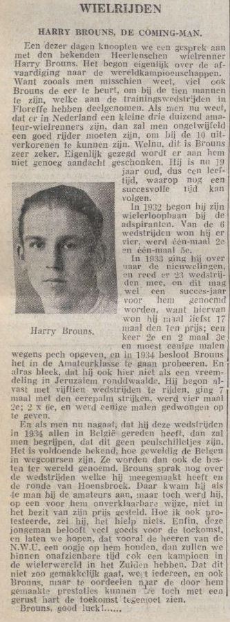 Een dezer dagen knoopten we een gesprek aan met de bekenden Heerlense wielrenner Harry Brouns. Het begon eigenlijk over de afvaardiging naar de wereldkampioenschappen. Want zoals men misschien weet, viel ook Brouns de eer te beurt, om bij de tien mannen te zijn, welke aan de trainingswedstrijden in Floreffe hebben deelgenomen. Als men nu weet, dat er in Nederland een kleine drie duizend amateur-wielrenners zijn, dan zal men ongetwijfeld een goed rijder moeten zijn, om bij de 10 uitverkorenen te kunnen zijn. Welnu, dit is Brouns zeer zeker. Eigenlijk gezegd wordt er aan hem niet genoeg aandacht geschonken. Hij is nu 19 jaar oud, dus een leeftijd, waarop nog een succesvolle lijd kan volgen. In 1932 begon hij zijn wielerloopbaan bij de adspiranten. Van de 6 wedstrijden won hij er vier, werd één-maal 2e en één-maal 5e. In 1933 ging hij over naar de nieuwelingen, en reed er 23 wedstrijden mee, en dit mag wel een succesjaar voor hem genoemd worden, want hiervan won hij maar liefst 17 maal de 1e prijs, een keer 2e en 2 maal 3e en moest enige malen wegens pech opgeven. Iin 1934 besloot Brouns het in de Amateurklasse te gaan proberen. En alras bleek, dat hij ook hier niet als een vreemdeling in Jeruzalem ronddwaalde. Hij begon alvast met vijftien wedstrijden te rijden, ging 7 maal met den erepalm strijken, werd vier maal 2e; 2 maal 6e, en werd enige malen gedwongen op te geven. En als men nu nagaat, dat hij deze wedstrijden in 1934 allen in België gereden heeft, dan zal men begrijpen, dat dit geen peulschilletjes zijn. Het is voldoende bekend, hoe geweldig de Belgen in wegcoursen zijn. Ze worden dan ook de beste ter wereld genoemd. Brouns sprak nog over de wedstrijden welke hij meegemaakt heeft en de Ronde van Hoensbroek. Daar kwam hij als 4e man bij de amateurs aan, maar toch werd hij, op een voor hem onverklaarbare wijze, niet in het bezit van zijn prijs gesteld. Hoe ik ook protesteerde, zei hij, het hielp niets. Enfin, deze jongeman belooft veel goeds voor de toekomst, en laten we hopen, dat vooral de heren van de N.W.U. een oogje op hem houden, dan zullen we binnen onafzienbare tijd ook een kampioen in de wielerwereld in het Zuiden hebben. Dat dit niet zo gemakkelijk gaat, weet iedereen, en ook Brouns, maar te oordelen naar de door hem gemaakte prestaties kunnen we toch met een gerust hart de toekomst tegemoet zien. Brouns, good luck!