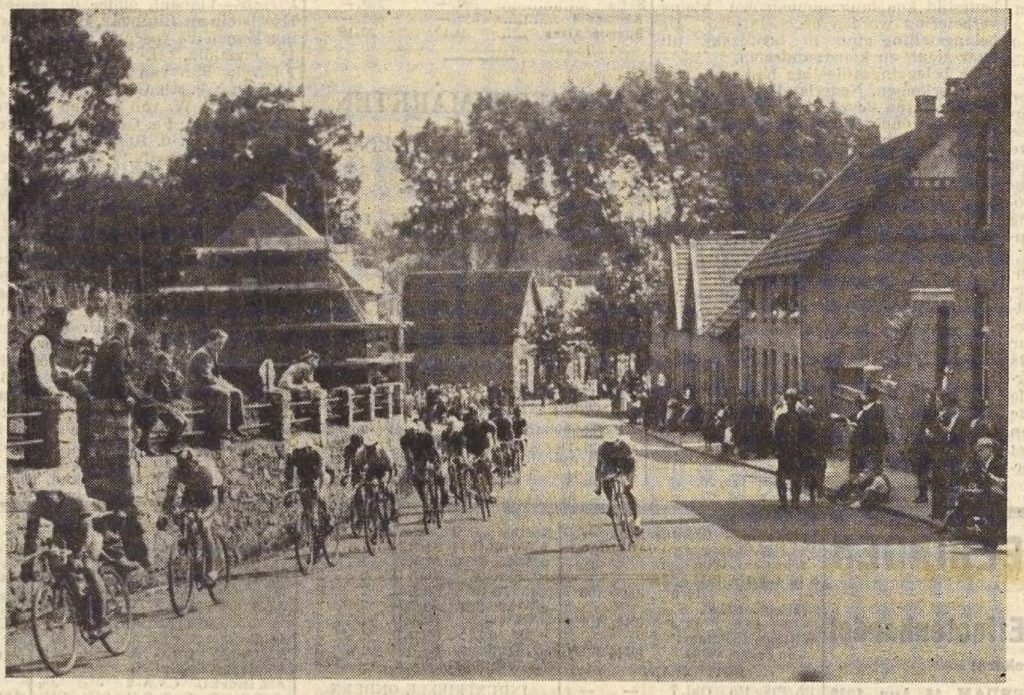 Om 2.30 uur wordt door den Z.Eerw. Heer Pastoor Röselaers het startschot gelost voor een groep van 60 amateurs, die het 2800 meter lange traject 25 keer zullen rijden, zodat deze dus 70 K.M. te rijden hebben. Reeds aanstonds wordt er een flink tempo ingezet en onder leiding van Verheul wordt de eerste ronde afgelegd in 16 3/5 sec. Het eerste slachtoffer is Schipper, die defect krijgt en een ronde achter raakt om later uit den strijd te verdwijnen. In de tweede ronde zijn het Staeren en Verheul die het peloton leiden en wordt de ronde in 4.25 2/5 afgelegd. Reeds noteren we Rulkens en Lutters als achterblijvers. Bij de derde ronde is er een premie welke Tulleneers weet binnen te palmen voor Helden met een kleine voorsprong op het peloton maar ze zetten niet door, zodat alles weer bij elkaar komt.