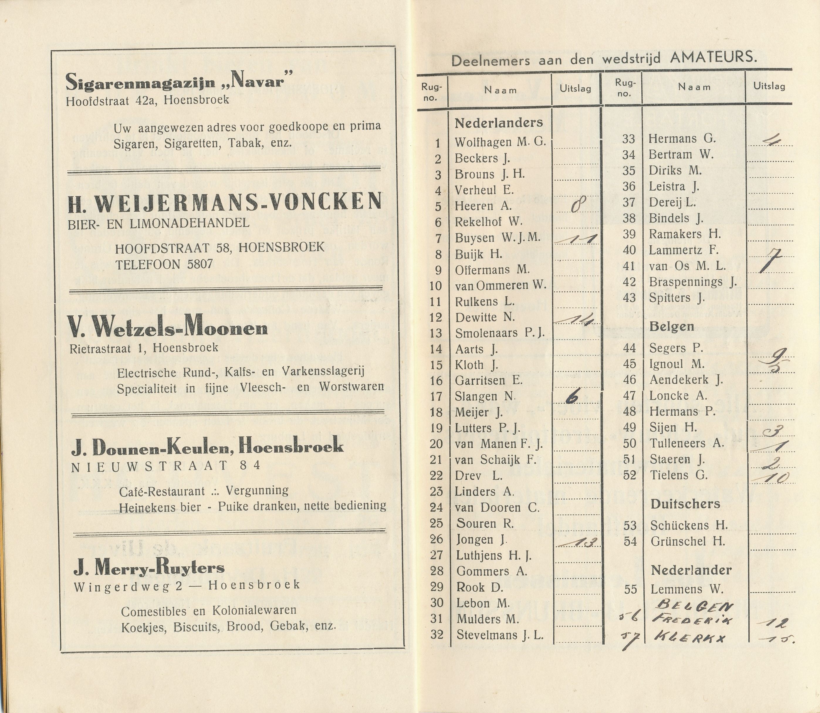 Dat voor België goede krachten aanwezig zijn is bekend, namen, zoals Haemerlink, Dictus, Billiet, Duerloo, Wauters, Horemans, Peers, Mertens, Leemans spreken voor zich zelf. Wij kunnen aannemen, dat deze mannen zullen trachten de Hollanders van zich af te schudden, zoals zij dat in Amstenrade klaar speelden. Dit zal hun in Hoensbroek echter niet zo glad zitten. Wij geven de Limburgers een zeer goeden raad om als een man bij de Belgen te blijven, d.w.z. dat wanneer de Limburgers ieder een Belg voor hun rekening nemen, deze geen kans krijgen om los te komen. In ieder geval dient hiervoor te worden gewaakt, om niet te worden verschalkt. Van de Duitsers noemen wij Esser en Reilander als de besten, doch geven hun weinig kans op een overwinning, daar het overige veld te sterk is.