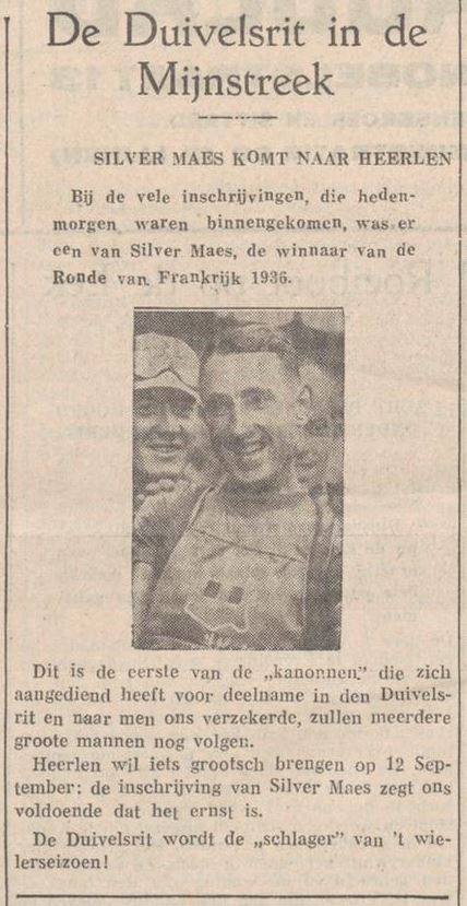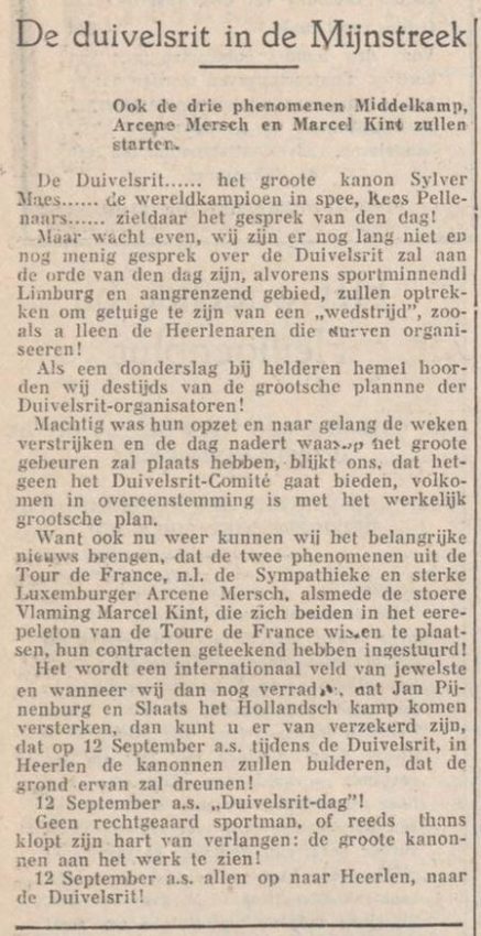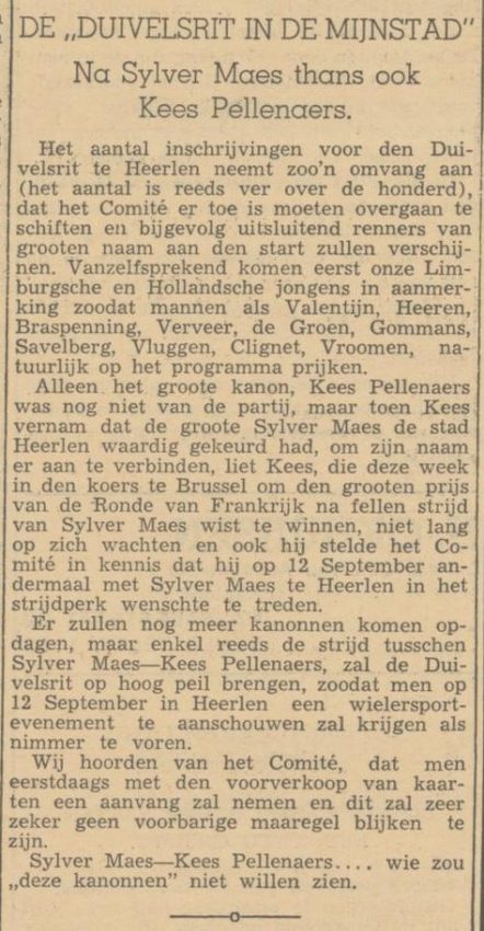 En hoe zit het met de Limburgse jongens? Het kan niet ontkend worden, dat onze Limburgse jongens in dit internationale milieu ’n zware taak staat te wachten. Zij zullen het hard te verantwoorden krijgen. Zullen zij een kans krijgen om in de prijzen te vallen. Waarom niet als zij samen willen werken, want de enkeling kan in deze monsterkoers niets bereiken. Dat zij dit begrijpen. Voor de sprinters is er wel wat te halen, Willy Vroomen, Savelsberg, Clignet, Pietje Ramaekers, om de besten maar te noemen, maken kans enige vette premies in de wacht te slepen als zij uit hun doppen kijken. Verder over de koers uit te wijden heeft geen zin. Het zal er duvelsch spannend en hard naar toe gaan. Daar kan men van verzekerd zijn. De prijzen en premies zijn niet mis en deze zijn een waarborg, dat het publiek zal kunnen genieten.