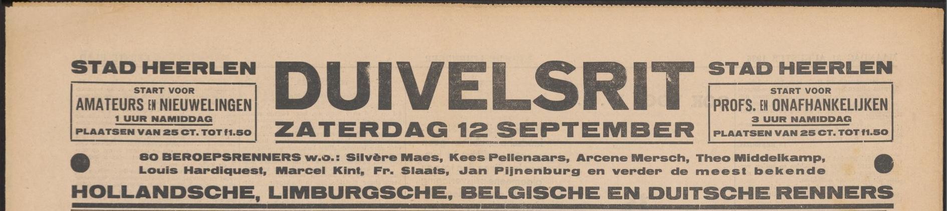 Toen het plan in Heerlen werd opgevat had men slechts twee maanden voor de boeg, een tijdsperiode, die op de keeper beschouwd niet veel tijd liet om iets bijzonders te presteren, maar de Heerlense heren dachten er anders over. In het kort gezegd. Men wilde in Heerlen ten bate van onze St. Vincentiusvereniging ook een ronde organiseren, maar een ronde, die alle voorgaande in de Mijnstreek zou overtreffen, want Heerlen als centrum van de mijnstreek, was het aan haar positie verplicht, daarmede voor den dag te komen. De organisatoren, de diverse commissies, zagen daarin een duivelswerk, en noemden mede daarom de ronde van Heerlen, de Duivelsrit in de Mijnstad, maar niet alleen daarom, want zij willen ook de koers tot iets bijzonders maken, het moet ook inderdaad een duivelsrit worden, die aan de deelnemers, zowel aan profs als amateurs en nieuwelingen het maximum aan energie en inspanning zal stellen, om een van die duivels grote prijzen, die in Heerlen beschikbaar worden gesteld in de wacht te slepen. Er moet als duivels gereden worden ! ! Ook ons rust daarom de plicht de heren van de diverse commissies een oprecht woord van hulde en dank te brengen voor hetgeen zij hebben gepresteerd, de commissie van financiën in liet bijzonder, die zich garant heeft gesteld, voor het grote bedrag dat met het organiseren van deze monsterrit is gemoeid. Onze Heerlense zakenmensen zullen volgaarne met deze hulde instemmen. Zeker zullen zij allereerst verheugd zijn over het feit, dat de Heerlense armen een flinke hulp wordt geboden, maar wanneer duizenden en duizenden zaterdag een gang naar het Bekkerveld zullen wagen, zullen ook zij zal ook Heerlen in het algemeen daarvan profiteren. In deze malaisetijd, waarin men alleen hoort van narigheid, van crisis waarin de zakenmensen alleen werken om hun belasting te kunnen opbrengen zullen zij met plezier zien hoe Heerlen, het middelpunt van de mijnstreek nog altijd is, want feit is toch maar, dat bij een of andere feestelijkheid in Heerlen, onze stad toch maar duizenden en duizenden trekt en dat die duizenden ook met graagte ook in onze stad verblijven, als er maar iets te doen is. Dat heeft de kermis in de afgelopen zomer, toen op kermiszondag de L. T.M.-tram niet minder dan tienduizend passagiers naar Heerlen vervoerde. In dit verband mogen wij ook van deze plaats een hartelijk woord van dank aan onze gemeentelijke autoriteiten brengen, die alle medewerking maar dan ook alle medewerking hebben verleend, om dit geweldige sportfestijn tot een daverend, tot een donderend succes te maken, tot heil van onze Heerlense armen, tot heil van onze Heerlense zakenmensen, tot heil van Heerlen zelf. Maar nu ter zake, de lezer zal dit wellicht lezen, maar eerlijk gezegd leest hjj liever iets over de Duivelsrit zelf, over haar inrichting, over de deelneming, over de prijzen en premies die hiervoor beschikbaar zijn gesteld. Dit laatste is ook niet mis, de Duivelsrit inde Mijnstad heeft niet voor niets zo’n duivelse naam en deze premie-regen zorgt er vast voor, dat de deelnemers, amateurs, nieuwelingen en profs en onafhankelijken als duivels zullen rijden om een van deze grote prijzen in de wacht te slepen.