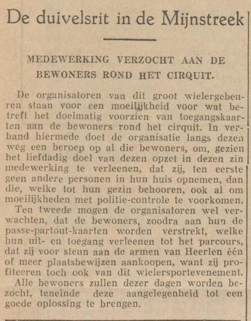 Dank zij de zorgen van Radio Begas worden de duizenden toeschouwers in staat gesteld zich microfonisch goed op de hoogte te laten stellen van de belangrijke mededelingen. Op elke 200 meter van het 2100 meter lange parcours wordt een luidspreker door genoemde firma opgesteld, zodat iedereen op elke plaats de mededelingen duidelijk kan verstaan. Langs de Bekkerweg zijn de zit- en staantribunes opgesteld, die tot een totaal van 5000 personen kunnen bevatten. Verder kan men langs het gehele parcours een goede plaats krijgen. Alle toegangswegen tot het parcours zijn afgesloten. Op de meesten daarvan bevinden zich de loketten waar de verkoop van kaarten plaats vindt n.l. de Vlotlaan, Ruys de Beerenbroucklaan, Kortestraat, Kruisstraat, hoek Nobelstraat, Welterlaan, Aarweg, hoek Benzenraderweg, Eurenderweg en Heesberg. Voor mensen die per auto van buiten Heerlen komen zij erop gewezen, dat de autoparkeerplaatsen zich rondom het parcours bevinden n.l. aan beide wegkanten van de Welterlaan, achter het gemeentehuis. Oliemolenstraat en Coriovallumstraat. De rijwielstallingen bevinden zich hoek Nobelstraat, van Hövel tot Westerflierstraat, hoek Kruisstraat-Nobelstr., hoek Lindestraat-Nobelstraat (richting Akerstraat naast Badhuis), hoek Raadhuisstraat-Nobelstraat (naast Prot. Kerk), midden Nobelstraat (richting Akerstraat), midden van Hövel tot Westerflierstraat, midden Raadhuisstraat (tegenover Prof. kerk), Kortestraat (richting van Hövel tot Westerflierstraat), Ruys de Beerenbroucklaan hoek Akerstraat, Nutschool, Heesberg hoek Caumerdalseweg, hoek Benzenraderweg-Eurenderweg Welterlaan en Lindestraat. De ordedienst langs het parcours wordt verzorgd door 80 manschappen marechaussee, rijksveldwacht en gemeentepolitie, terwijl de Heerlense padvinders eveneens hunne gewaardeerde medewerking verlenen, en de dames van het Rode Kruis langs het parcours programma’s en speldjes zullen aanbieden.