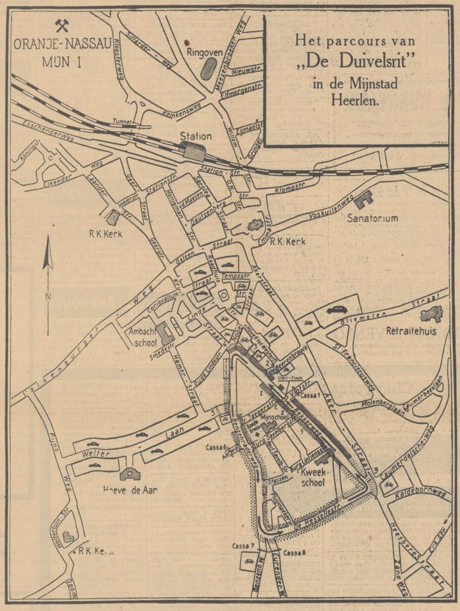 Wij geloven, dat wij onze lezers gerust een stukje geschiedenis kunnen besparen over de geboorten van de Rondes. Wij weten zo zachtjes aan wel, dat burgemeester Martin van Hoensbroek de geestelijke vader van deze koersen is geweest, dat hij de eerste is geweest, die begreep, dat de mensen iets anders moest worden voorgezet als een baanwedstrijd, wilde de wielrennerij niet een roemloze dood sterven. Maar wij dwalen weer af. Wij zeiden dat wij over de Duivelsrit zelf zouden schrijven en wij beginnen met het parcours. De meesten onzer weten reeds hoe het parcours loopt, dat 2100 meter lang is, maar gaarne duiden wij het nog eens aan. De start is op den Bekkerweg, ter hoogte van de Vlotlaan. De renners rijden deze af in de richting van de Kruisstraat, slaan bij de bloemisterij van Erven den hoek om en rijden vervolgens de Benzenraderweg af, tot aan de Eurenderweg, om dan de klimmende Hessellestraat (thans bekend als de Burg. Waszinkstraat) op te rijden. Op de hoek van deze straat slaan zij weer om en duikelen dan met een „duivelse” vaart een gedeelte van den Heesberg af om weer op den Bekkerweg te komen. Natuurlijk zijn er criticasters die menen, dat het parcours geen moeilijkheden zal bieden, omdat het wegdek van macadam is. Dit is om den „duivel” niet waar. In het gehele parcours zit een stevige stijging. Bij de Heesberg moge men met een flinke vaart naar beneden duikelen, maar zo gauw men het grootste gedeelte van de Bekkerweg beeft gehad, komt een flinke stijging, die op den Benzenraderweg nog groter wordt, om op de Hesellestraat in een soort berghelling te eindigen, die niet voor de poes zal zijn. Wij halen in dit verband een uitspraak van een renner aan die deze week op ’t traject geoefend heeft. „De eerste 10 ronden, zei hij, merkt men niet zoveel van de Hessellestraat, maar daarna wordt zij steeds zwaarder, en de meeste renners zullen daarover „hun nek breken”. Dat belooft dus wat op dat gedeelte. Dank zij de zorgen van het Heerlense gemeentebestuur zijn enige nodige verbeteringen aan het traject aangebracht. De bocht bij de bloemisterij van Erven is aan de overkant bij de muurzijde opgehoogd, benevens zijn tegen de muur strobalen aangebracht, zodat gevaarlijke tuimelingen zijn uitgesloten.