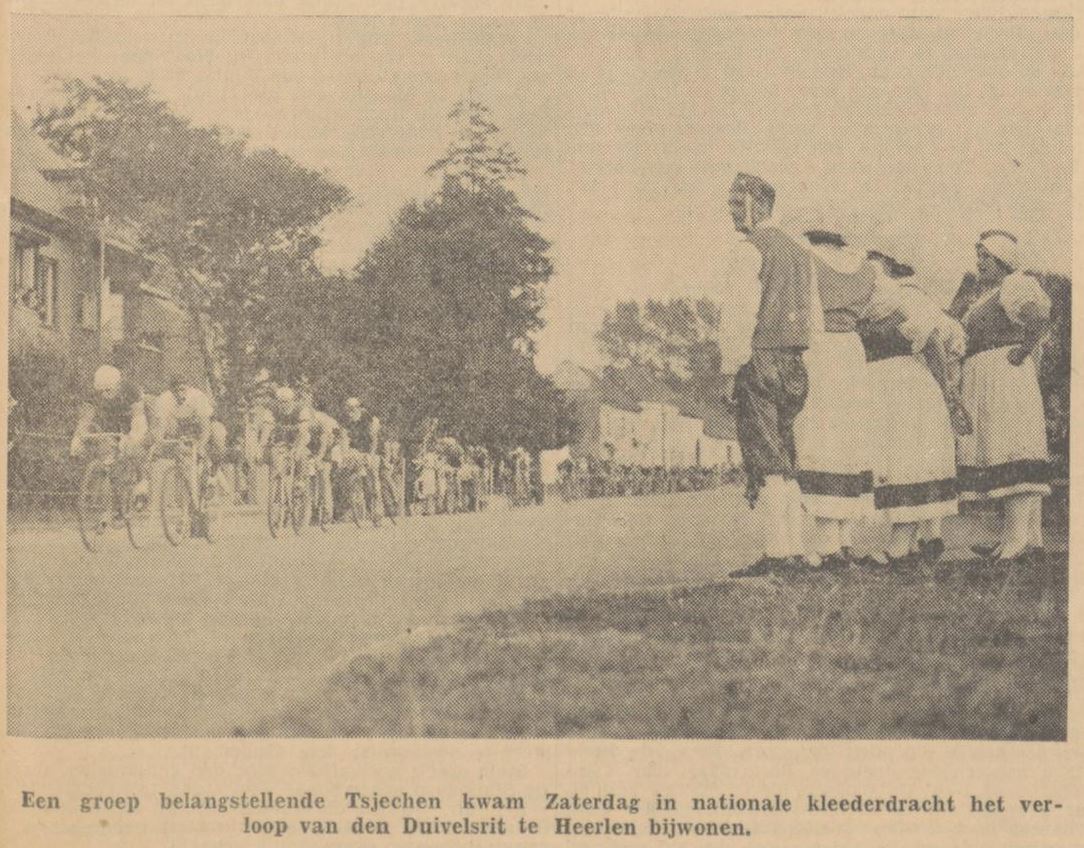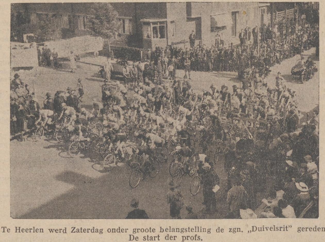 Toen de eerste Heerlenaren in de welgedane gemoedelijkheid van “zo-maar-een-vrije-dag” in de ochtend eens een wandelingetje gingen maken, arriveerden de eerste autobussen en touringcars en fietsers en gewone auto’s reeds in de stad. En toen het tegen de tijd voor de middagmaaltijd begon te lopen, groeide de belangstelling bij den Bekkerweg, waar de start en de finish van de Duivelsrit zou komen, sterk aan. Dat het vanaf het moment, dat er iets gebouwd werd, hier een verzamelpunt van belangstellenden was geweest, spreekt intussen vanzelf. Om twaalf uur is de gehele route van de wegwedstrijd door de politie afgesloten en tegelijkertijd begonnen toen ook de eerste betalende bezoekers reeds naar de plaatsen te komen. En toen het zo langzaamaan één uur was geworden en de toebereidselen werden gemaakt voor de start van de nieuwelingen en de amateurs, toen was het grootste gedeelte van den weg reeds omzoomd door ’n dichte haag toeschouwers, die in gespannen aandacht te wachten stonden op de knal uit het startschot.